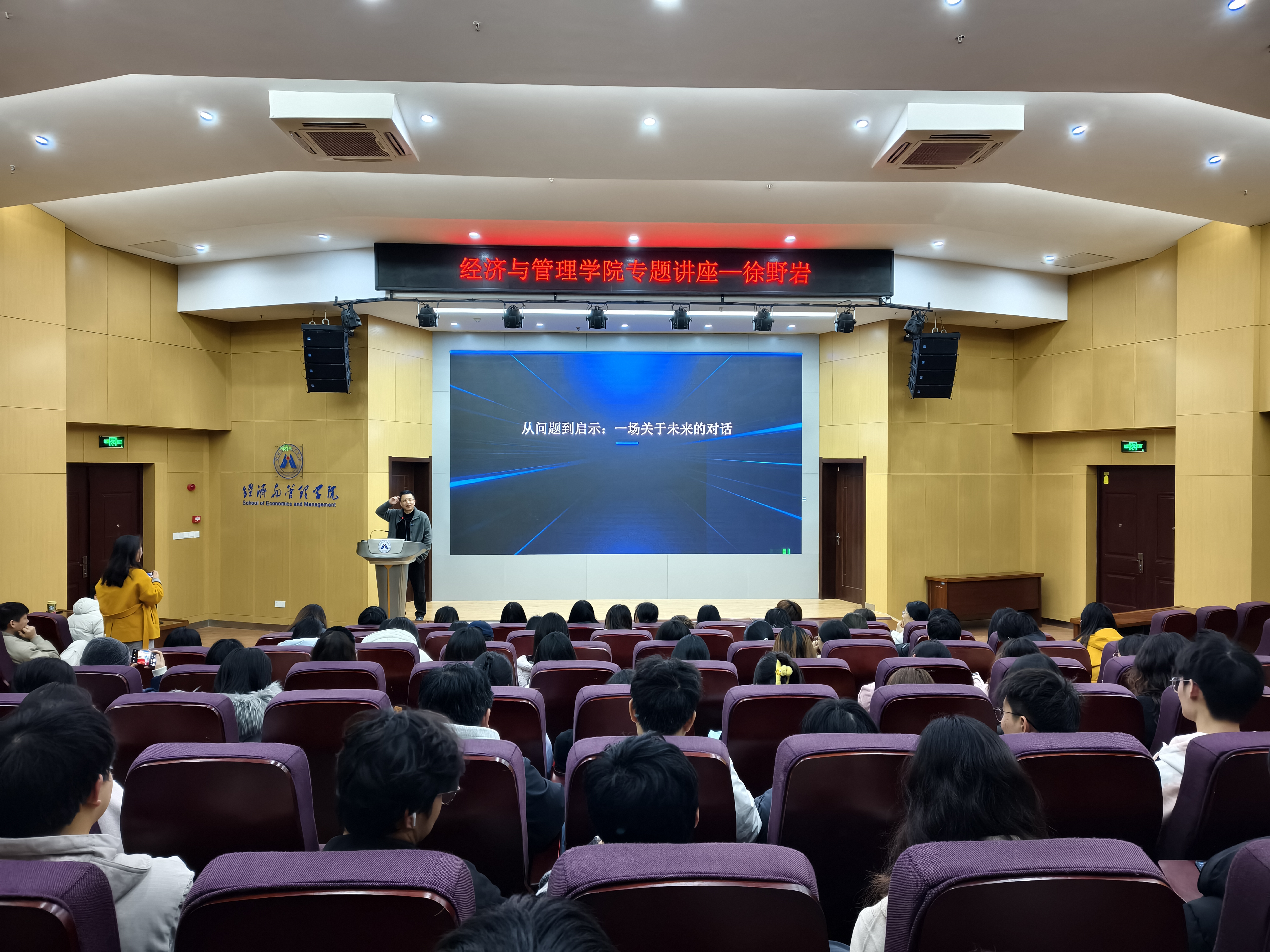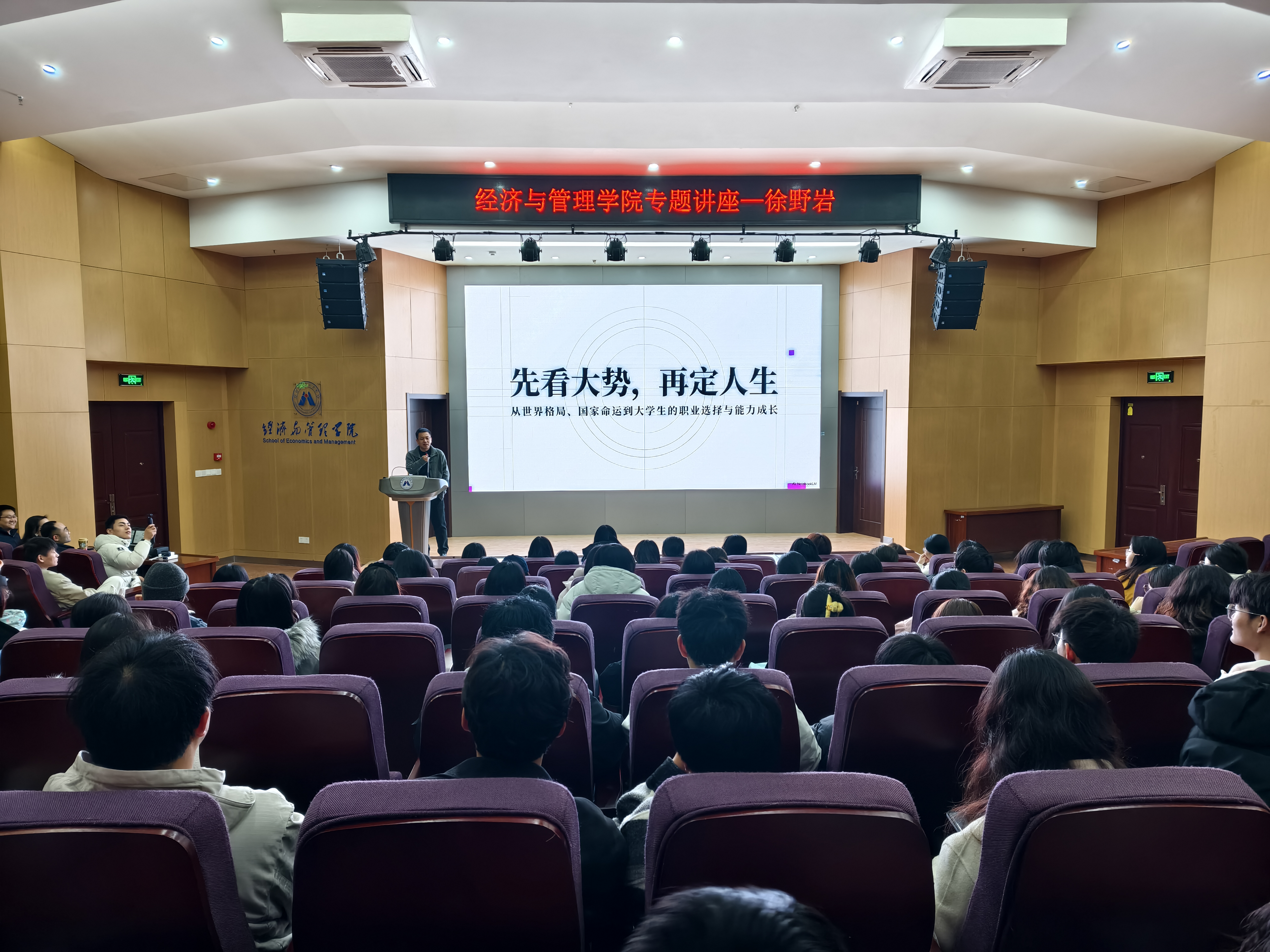 为引导青年学子认清时代发展大势、科学规划人生方向,3月18日晚,经济与管理学院在C座7楼报告厅成功举办《先看大势,再定人生》主题讲座。本次讲座作为学院第二课堂“学智”类特色品牌活动,特邀徐野岩老师担任主讲嘉宾,学院国际经济与贸易专业百余名学子到场聆听。