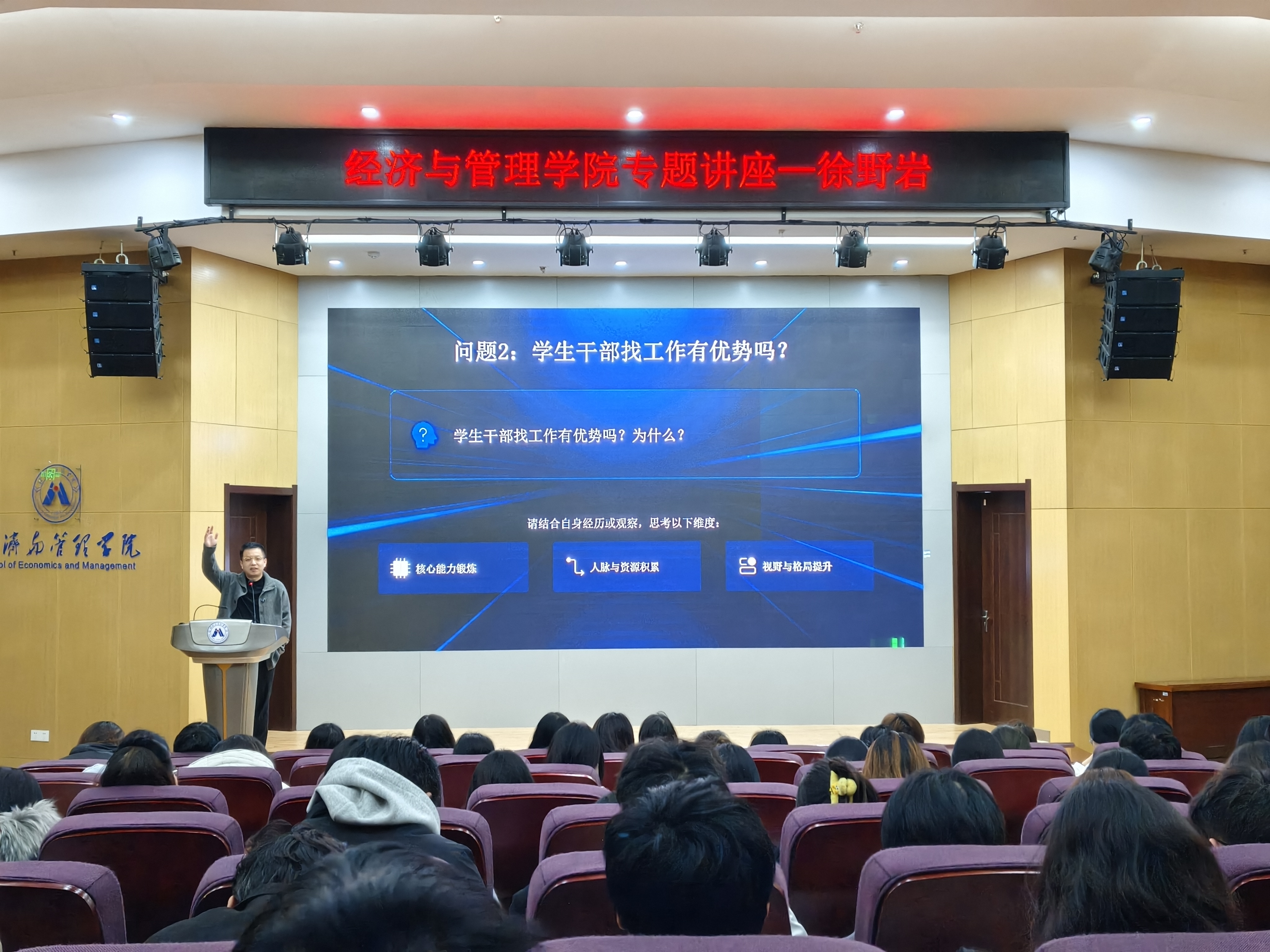 现场互动气氛热烈,同学们结合自身困惑踊跃提问,从“学生干部经历的职场价值”到“AI时代的职业技能储备”,徐野岩逐一细致解答,在思想碰撞中为学子们拨开成长迷雾。