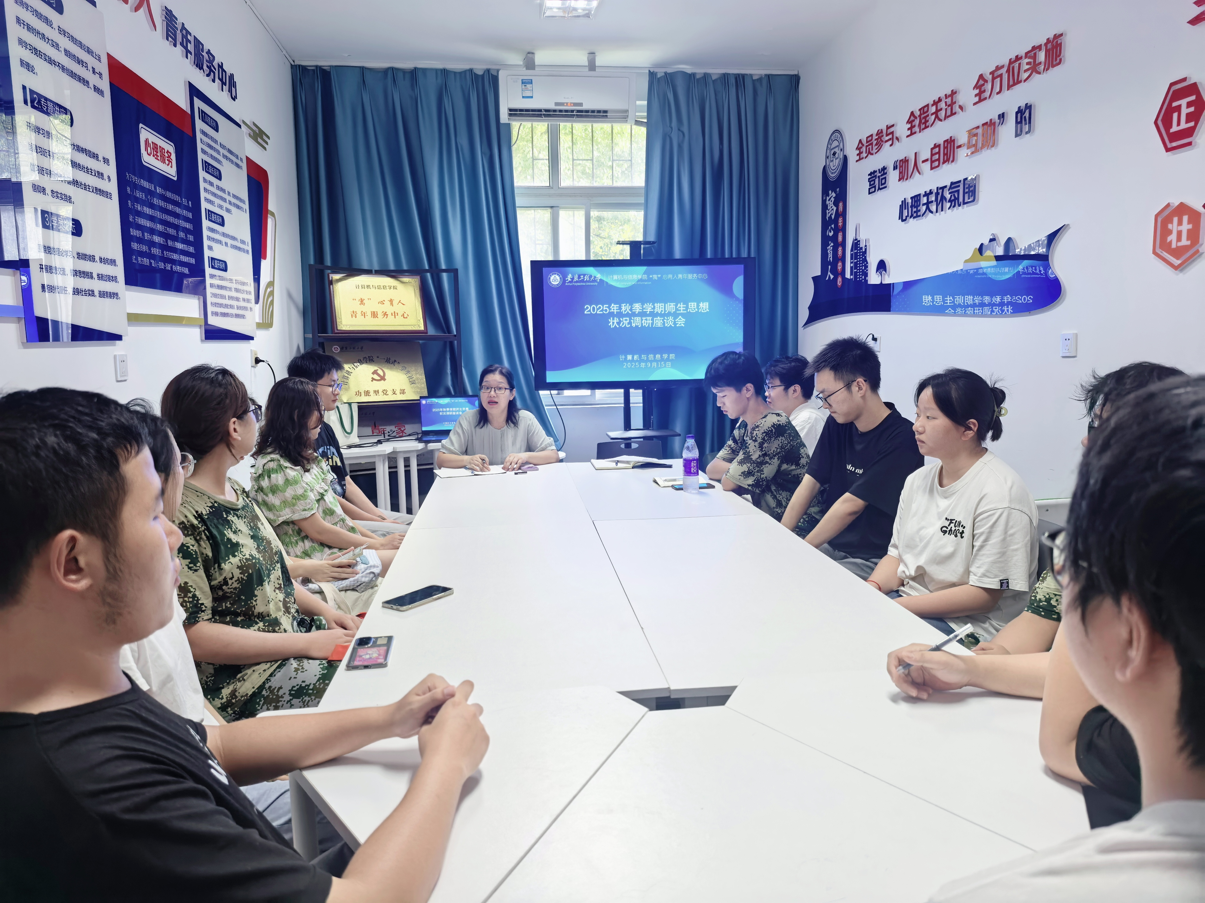 9月15日,计算机与信息学院在学院“寓”心育人青年服务中心召开秋季学期学生思想状况调研座谈会。学院党委副书记孙德茹、学院团委书记孙力力及15名学生代表参加。