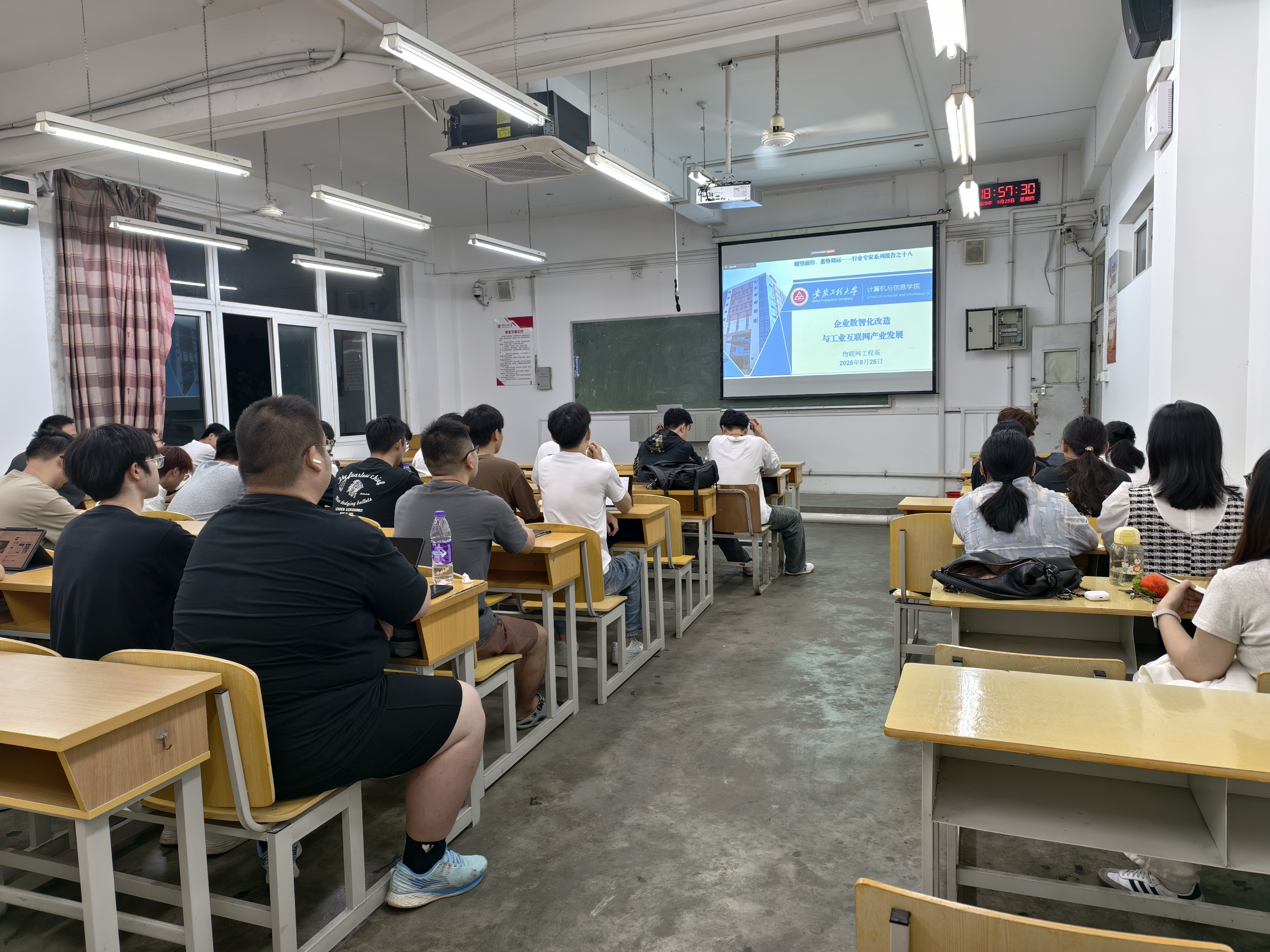 9月25日晚,安徽工程大学计算机与信息学院成功举办了一场以“企业数智化改造与工业互联网产业发展”为主题的讲座。本次会议邀请了安徽共生众服供应链技术研究院副总经理(首席软件架构师)周翔、深圳市东陆科技有限公司信息化部经理(高级工程师)黄天华、新道科技教育规划专家(同时兼任用友网络智能制造领域领军人物及工业互联网架构师)金星伟结合企业实践做了三场报告。本次活动由物联网工程系主任章平主持,计算机与信息学院紫云英班(智唐班、工业互联网班)学员、研究生课程《工业互联网概论(校企合作)》全体学员以及学院部分教师和学生参加了会议。