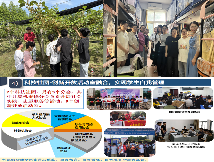 学院紧紧围绕立德树人根本任务,落实“以学生为中心”工作思想,扎实推进“三全六专”育人实践,依托双创中心功能型党支部和“一站式”学生社区功能型党支部,打造了“E”路同行之榜样有我、青春有我、倾听有我系列特色育人品牌,推动学生在学科竞赛、学业发展、身心健康、劳动实践等方面取得显著成效,育人品牌效应突出。近三年,学生在中国国际大学生创新大赛、全国大学生智能汽车竞赛等赛事中屡屡获奖,荣获全国大学生职业规划大赛国赛铜奖、亚洲“Z世代创变新势力”、“中国大学生自强之星”、中国大学生跆拳道锦标赛金牌、安徽省大学生武术比赛冠军等多项荣誉。此外,计算机协会荣登安徽省“活力社团”TOP100榜单,3个团支部获评校级“活力团支部”,4名学生获评校级“十佳大学生”。