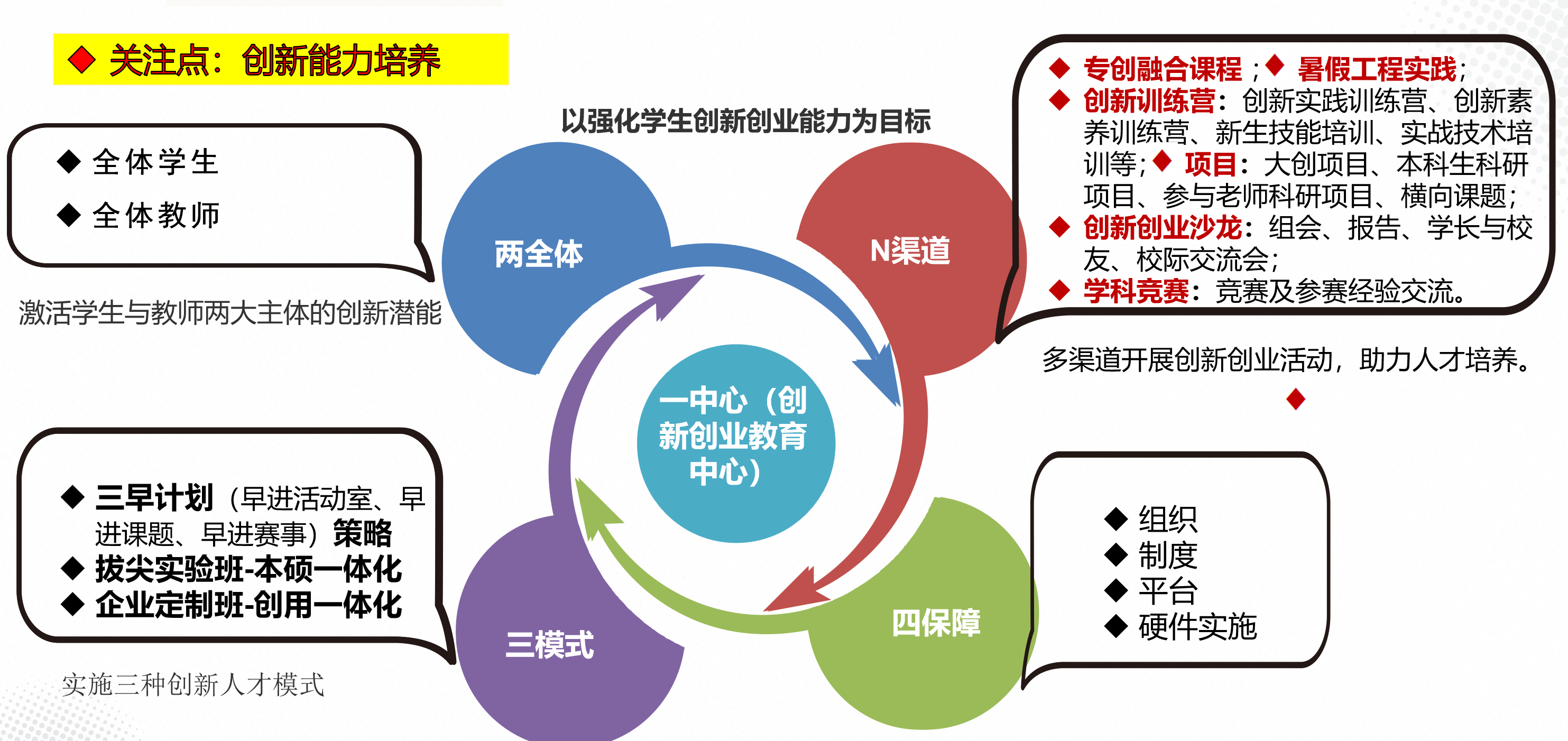 学院以强化学生创新创业能力为目标,紧扣“以赛促学,增强创新能力”的核心,构建了“一中心、两全体、三模式、四保障、N渠道”的创新创业实践体系。通过专创融合课程、暑假工程实践、创新训练营、创新创业沙龙、学科竞赛等多渠道开展创新创业活动,鼓励所有学生“进实验室、进赛事、进团队、进课题、进企业”。通过开展“实验室开放日”“创新实践训练营”“创新素养训练营”等活动,组织学生参加“中国大学生创新创业大赛”“中国大学生智能汽车竞赛”等多种赛事,形成“一室多赛”学科竞赛格局,培养学生创新能力和创业意识。