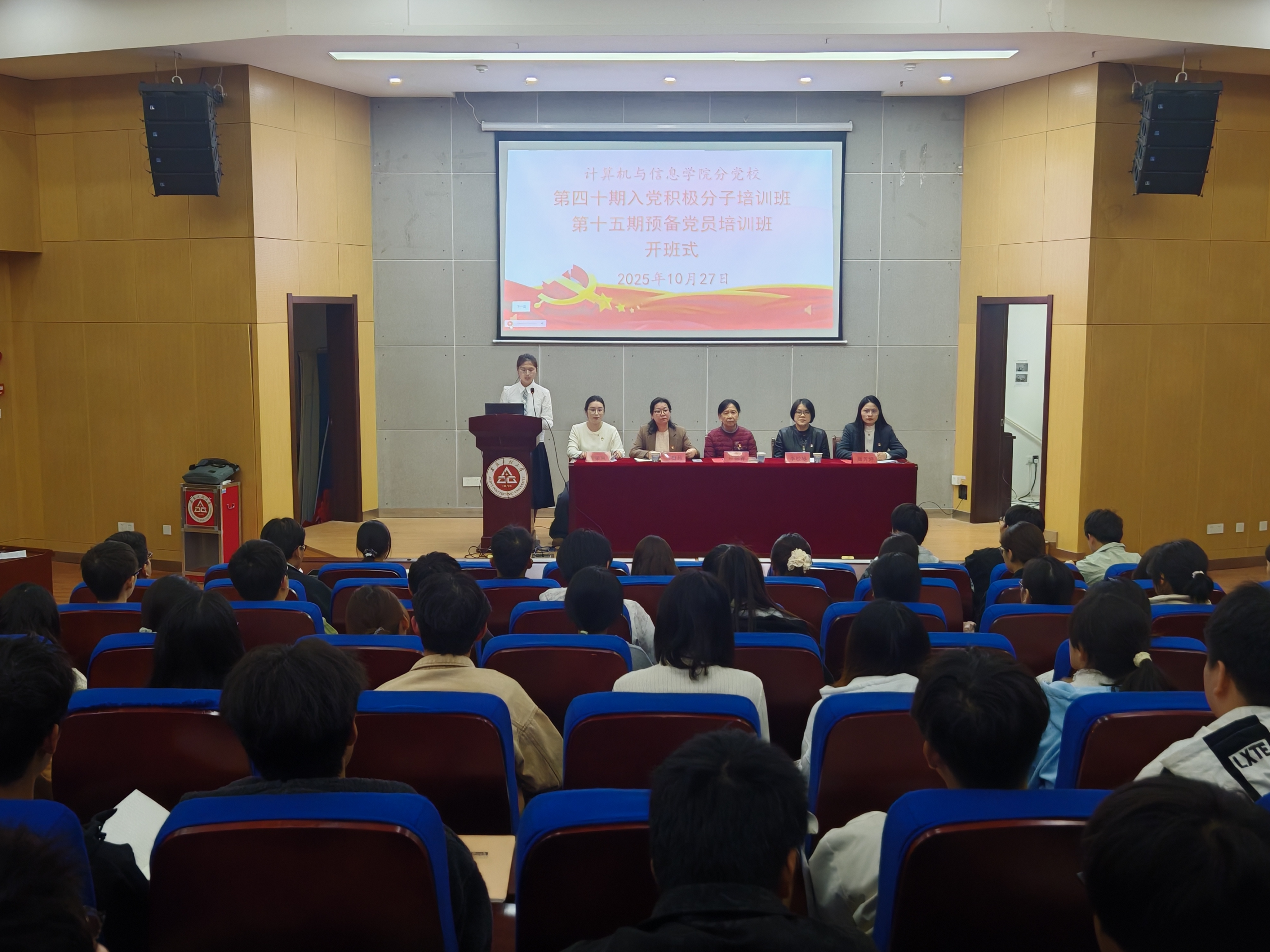 10月27日,计算机与信息学院分党校第四十期入党积极分子培训班、第十五期预备党员培训班开班式在C座5楼报告厅隆重举行。校党校第三片区督导组组长许晓菁到会指导,外国语学院党委副书记李校林、计算机与信息学院党委副书记孙德茹、培训班班主任周芳婷、周荣凤及培训班全体学员参加开班式。开班式由周荣凤主持。