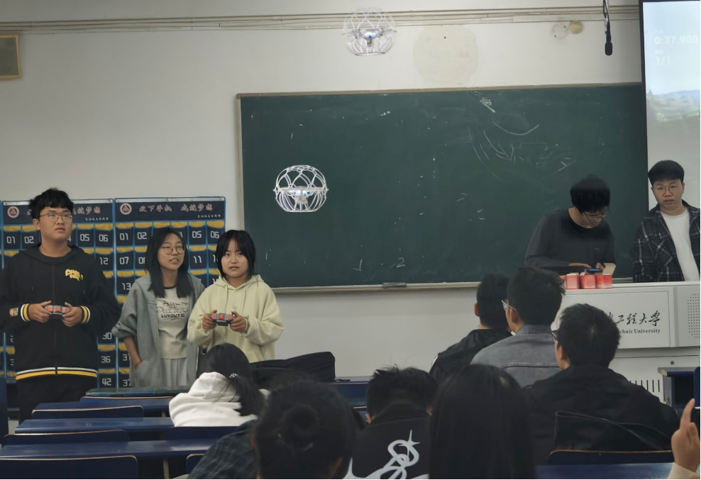 实操环节中,许慧君同学进行精准辅导,从遥控器操作手法、飞行姿态判断,到应急情况处理技巧,她耐心示范每一个动作要领,引导同学们亲手操控无人机完成指定飞行动作。现场氛围热烈,同学们热情高涨,纷纷上手实践,在反复尝试与调整中掌握操作技巧,切实将理论知识转化为实践能力,每个人都收获颇丰。