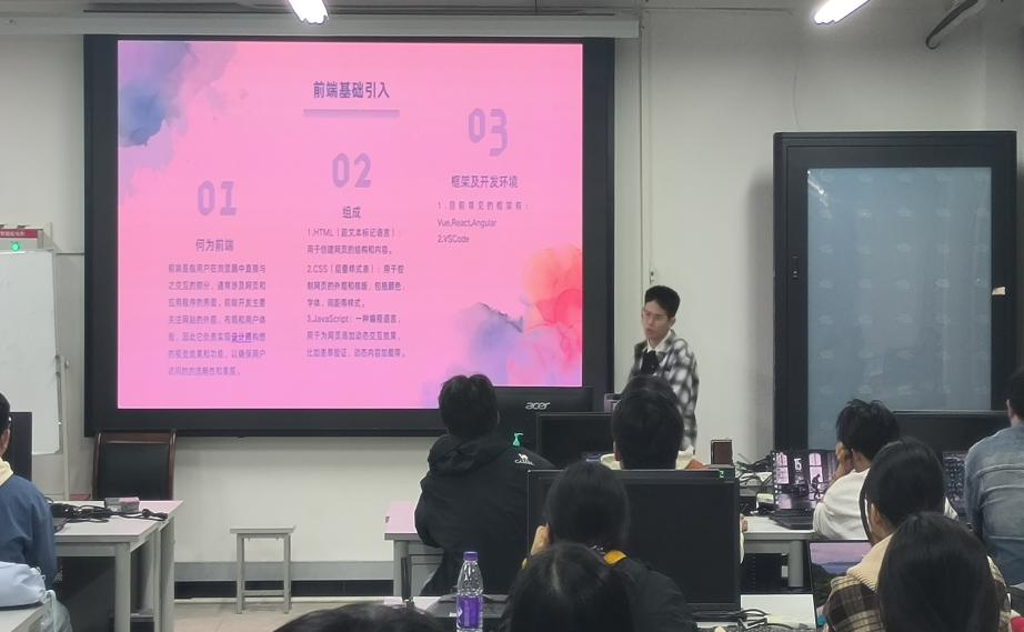 第二轮培训围绕“Web应用开发”展开,余伯仲同学从“前端技术是什么”切入,讲解前端开发的作用与HTML、CSS、JavaScript的逻辑关系。通过编写简单网页代码,详解HTML标签分类、语法与使用场景,帮助大一新生通过实操掌握HTML基础知识。