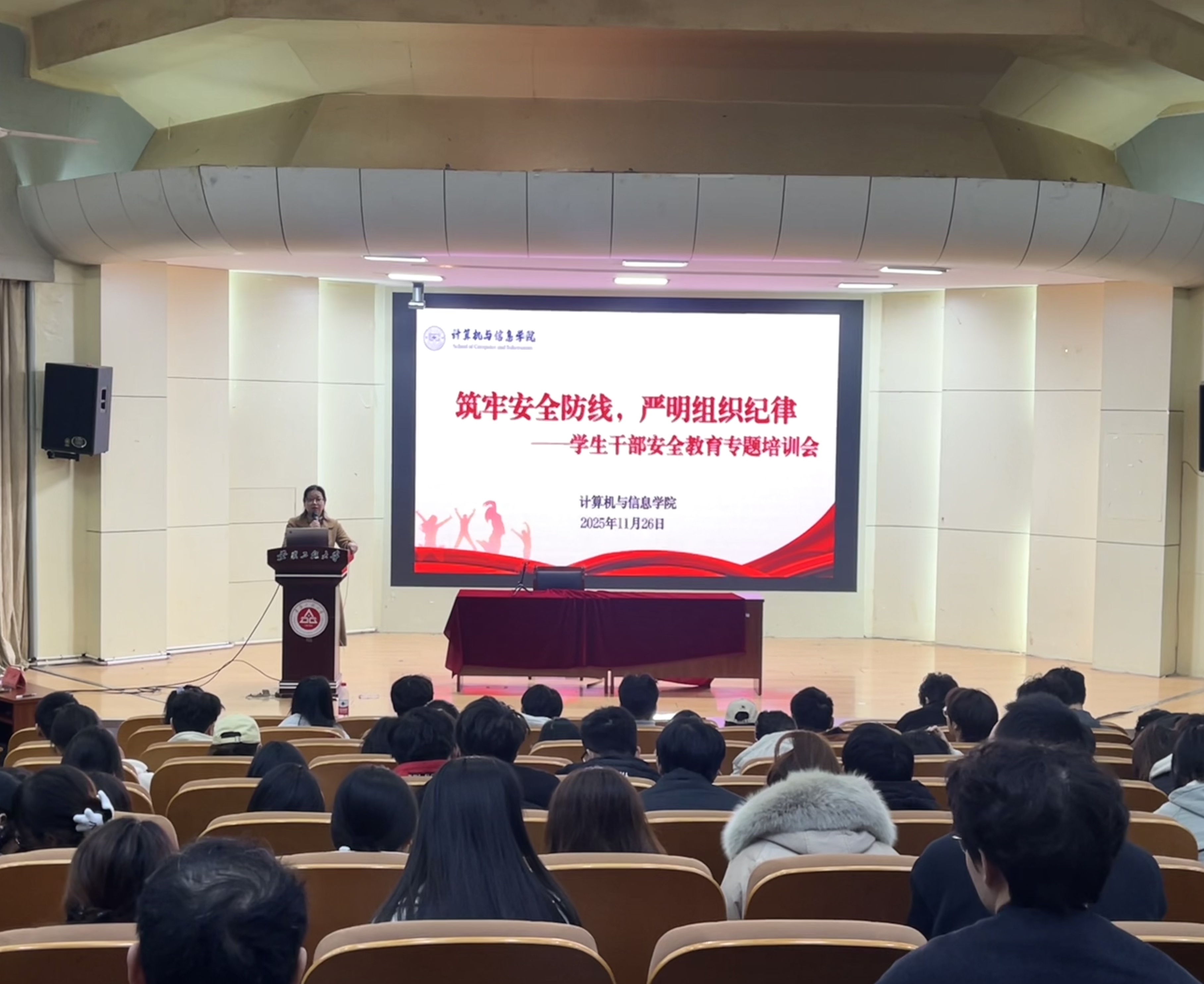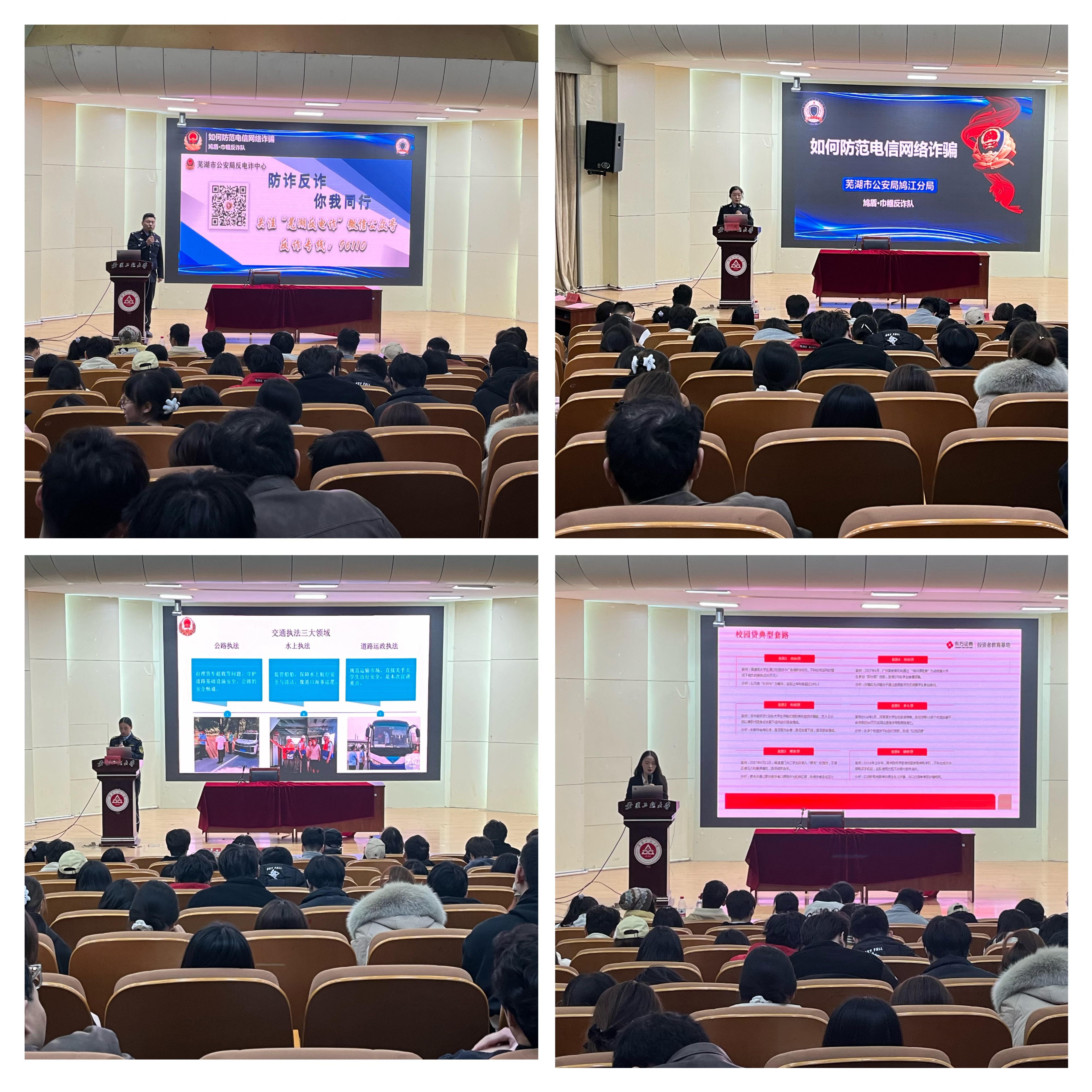11月26日下午,计算机与信息学院联合鸠江区公安分局组织开展以网络诈骗、交通安全为主题的安全教育专题培训。学院党委副书记孙德茹、鸠江区公安分局反诈中心主任李智、芜湖市交通运输综合行政执法支队李晨屿、鸠江区公安分局反诈中心民警王凡,学院各级主要学生干部、“龙舌花”志愿服务团队成员等共计 300 余人参加。培训会由学院团委兼职副书记瞿陆子慧主持。