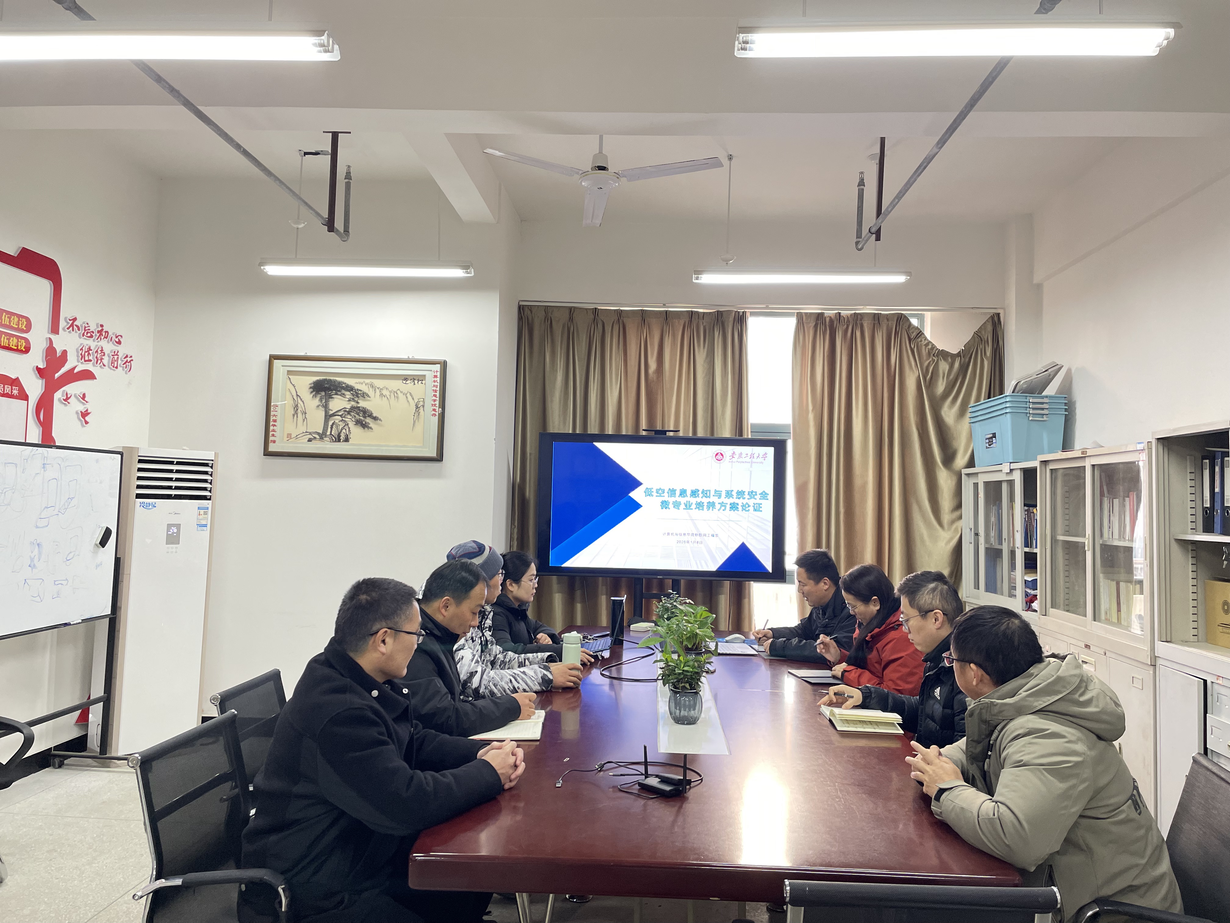 会上,章平首先对微专业的基本情况进行了详细汇报,方案紧扣“空-天-地-数”融合感知与安全防护技术前沿,旨在培养具备低空多源信息获取、高精度定位、系统安全渗透与合规管控能力的复合型人才。在讨论环节,刘涛与参会老师重点围绕课程体系的科学性与实践性展开了热烈研讨。大家一致认为,方案中构建的“基础模块+专业模块+实践模块”三阶能力培养框架逻辑清晰,同时对部分课程进行了微调。设置的核心课程,突破了传统单一学科边界,有效地将计算机、电子信息、网络安全与航空航天技术进行了有机融合。