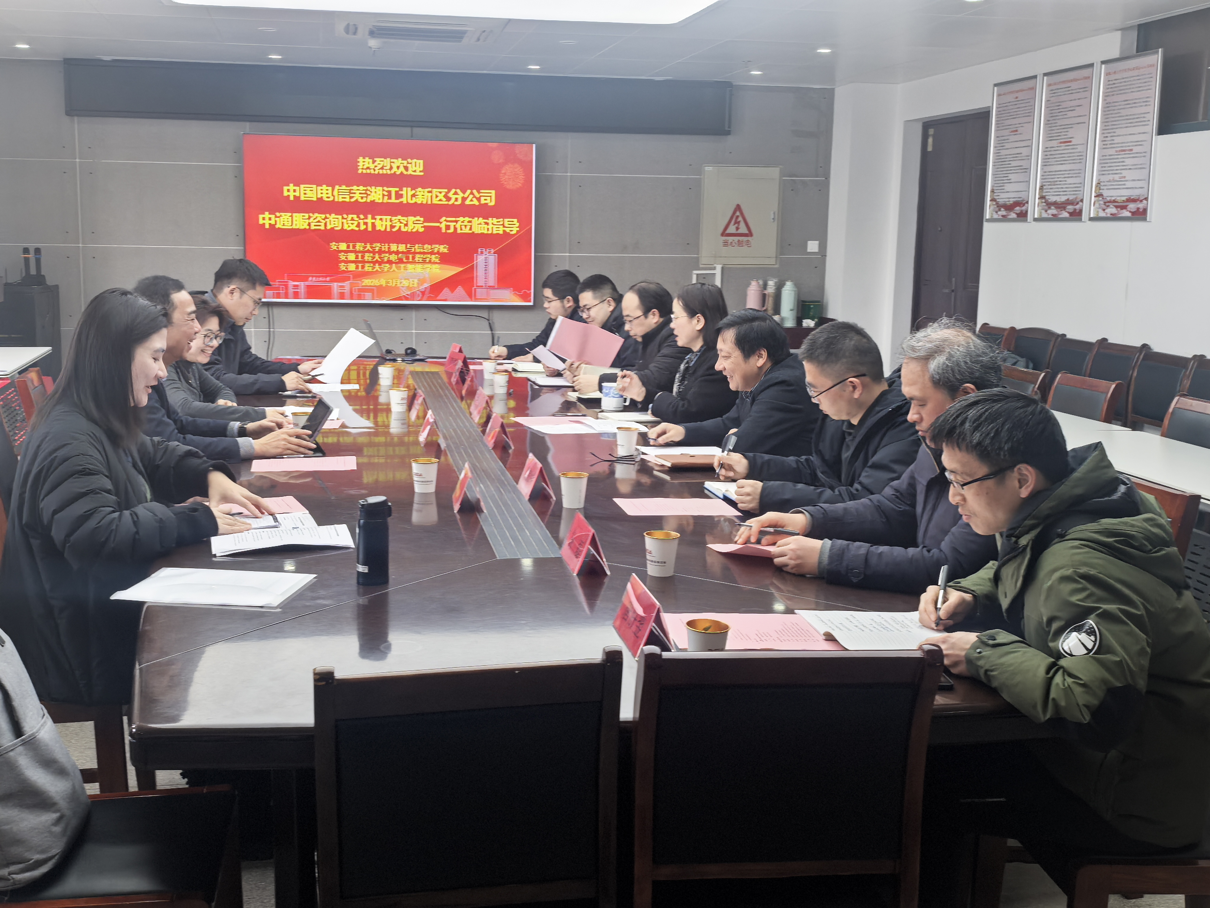 为高质量推进芜湖江北新区集中实训基地建设,切实提升实训基地与产业、与院校的适配性,受江北新区委托,3月20日上午,中通服咨询设计研究院有限公司侯聪聪一行携中国电信芜湖江北新区公司经理黄锋来我校开展专题调研,重点了解我校相关学院现有实训基地建设情况及发展诉求,计算机与信息学院组织了此次活动。会议由计算机与信息学院副院长刘涛主持,电气工程学院副院长黄宜庆、人工智能学院副院长赵转哲及相关教师参会。