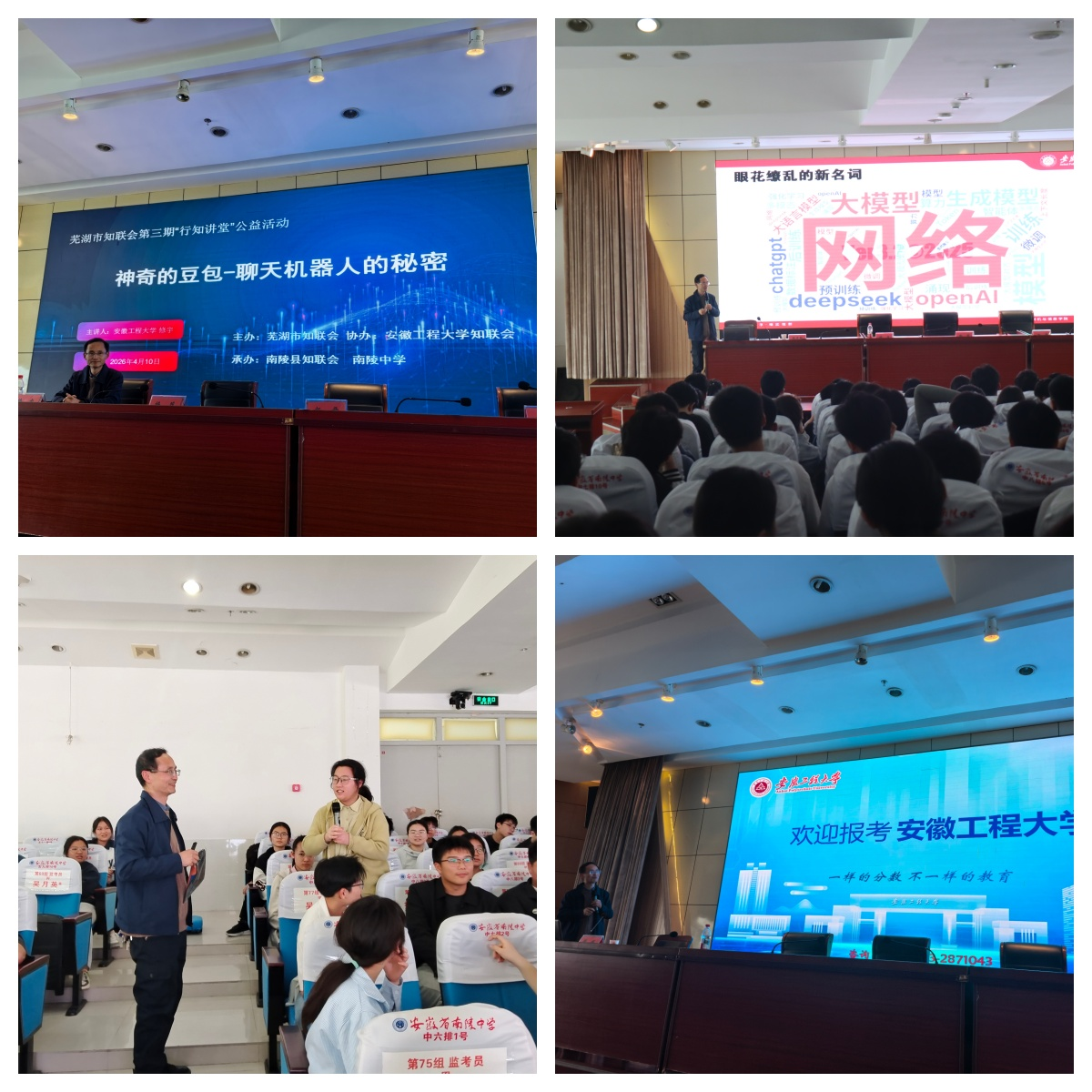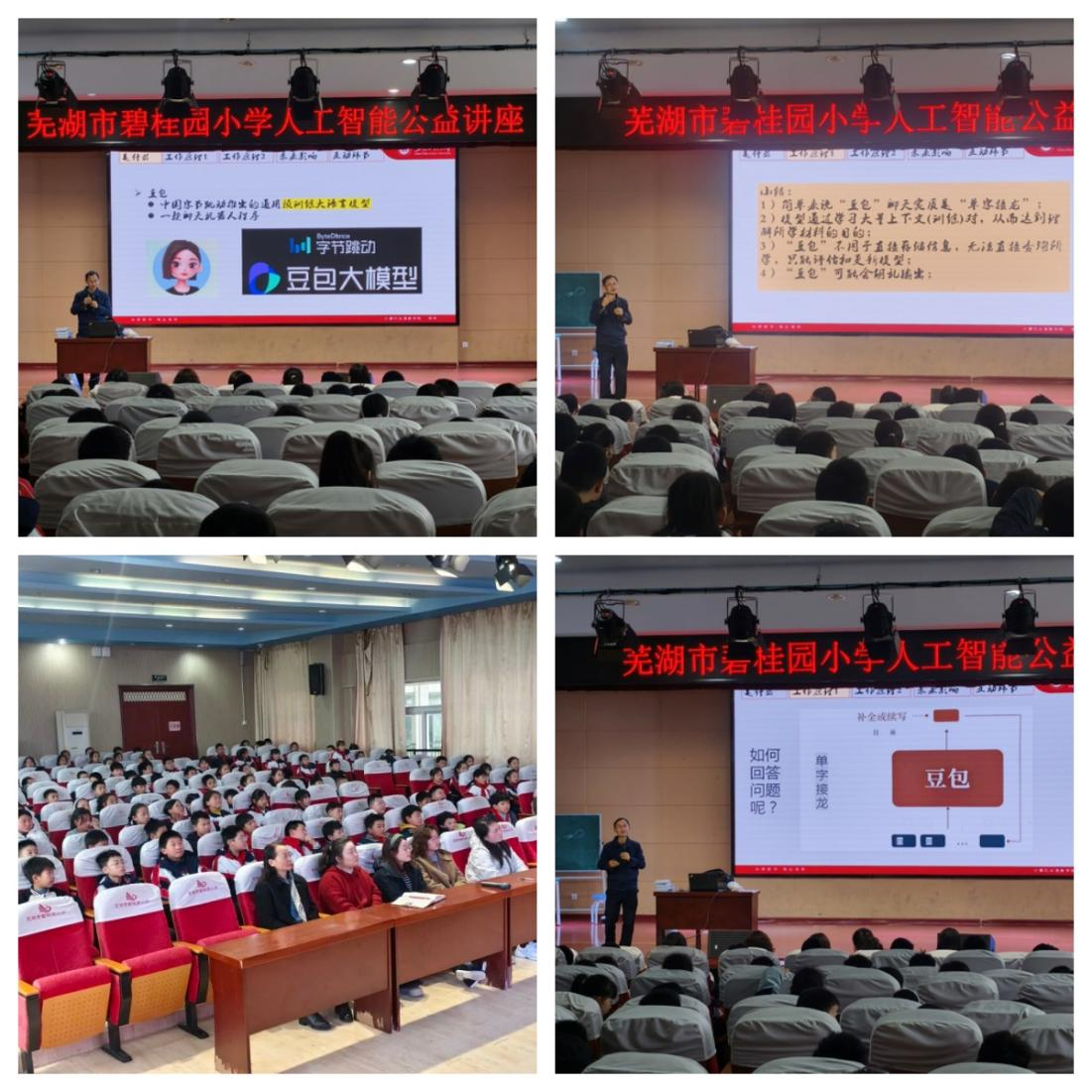 在碧桂园小学和南陵中学,计算机与信息学院创新创业教育中心主任修宇老师分别针对小学生和高中生以《神奇的豆包——聊天机器人的秘密》为主题讲解了大语言模型的概念、原理、其对社会的影响与未来的挑战。针对小学生特点,讲座设置了有奖互动环节,让学生们对大模型的基本工作原理、大模型优劣势等核心问题进行抢答,同学们回答问题积极热情,现场氛围高涨。针对高中生特点,讲座设置了现场豆包体验环节,通过无标准答案的问题,让同学们感受大模型对无标准答案问题回答的质量,直观感受大语言模型中“强化学习”的原理。同时参会老师向高中生介绍了我校有关战略性新兴产业相关专业,和我校“一样分数,不一样的教育”的特色,强调当前人工智能、机器人等领域仍有诸多难题亟待攻克,而我校的专业学习将为同学们未来迎接挑战、探索未知提供广阔平台,希望未来能与大家在大学校园相遇。