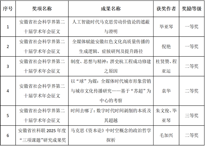 日前,安徽省社科联公布了2025年度学术年会优秀论文、“三项课题”研究成果奖评选结果,马克思主义学院师生积极参加,6项成果获得奖励。