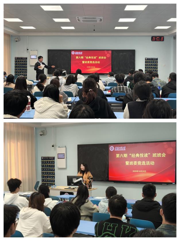 利昕云详细介绍了《安徽工程大学“经典悦读”班管理办法》,解读了《“为中国式现代化挺膺担当——青春年少好读书”2025年主题读书季暨“少年博览杯”读书感悟征集活动工作指引》;隋迪就班委会的职责和重要性、竞选流程和投票方式进行细致说明,肯定了参选学员的勇气与担当。