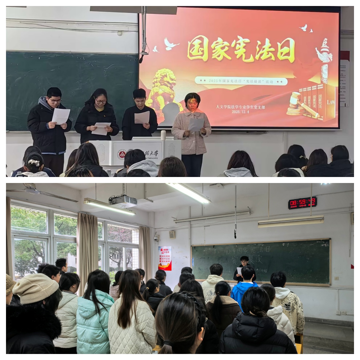 2025年12月4日是第十二个国家宪法日,为弘扬宪法精神,营造崇尚宪法、遵守宪法、维护宪法的浓厚氛围,人文学院法学专业学生党支部、法学专业各团支部共同开展了“宪法晨读”主题活动。