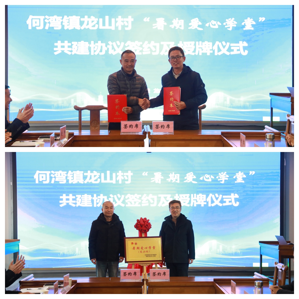 会上,校团委书记李恒奎与孙刚签署了暑期爱心学堂共建协议。人文学院党委书记刘一与何湾镇人大主席程绪峰共同为暑期爱心学堂揭牌。