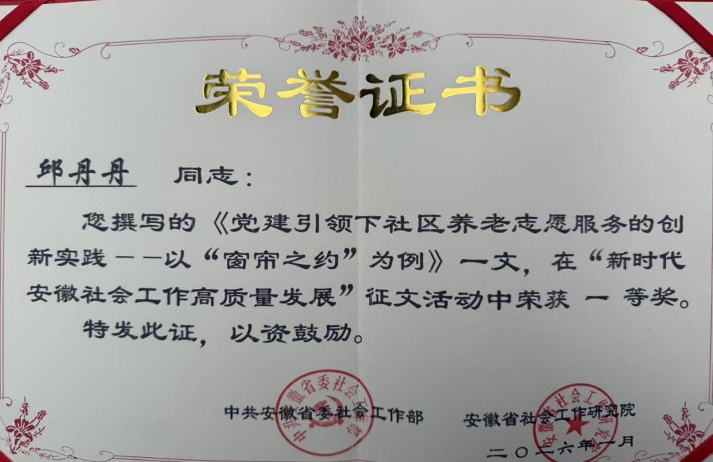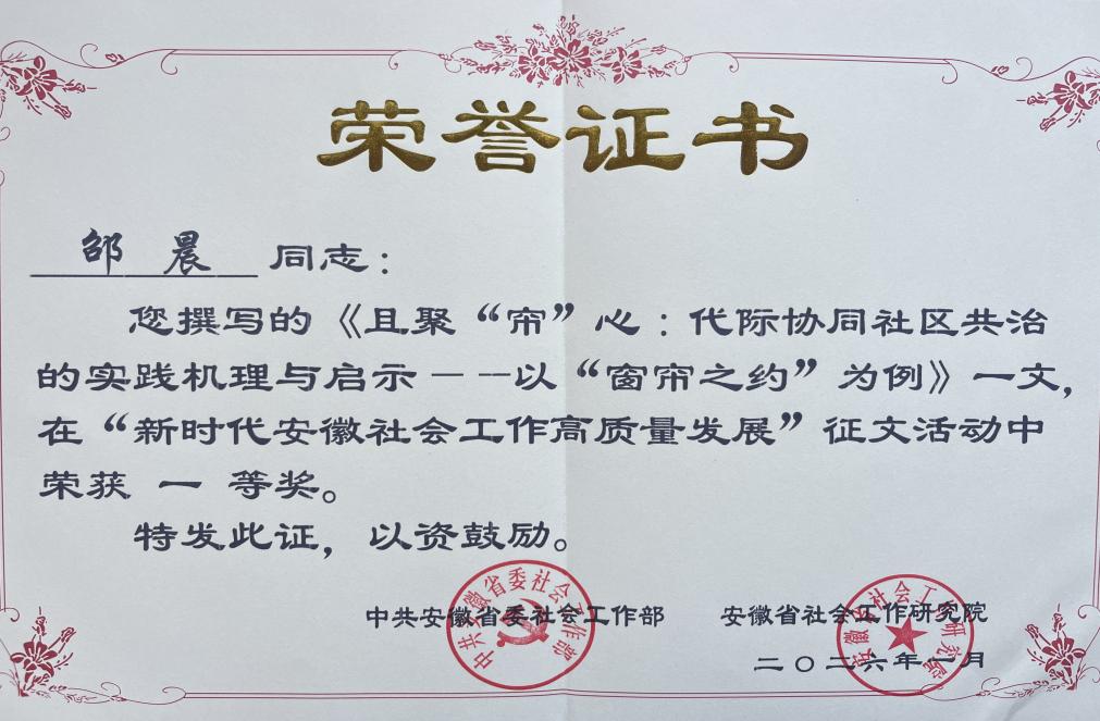两篇获奖论文均聚焦“窗帘之约”项目,分别从党建引领和代际协同的视角展开研究,为基层社会治理创新提供了鲜活样本。这一成果不仅是我校社会工作研究生学生学术创新能力的表现,也是人文学院社会工作专业人才培养质量的有力彰显。近年来,人文学院积极引导学生将专业理论与社会服务实践深度结合,未来也将继续深化政产学研用融合,为推动新时代安徽社会工作高质量发展贡献智慧与力量。