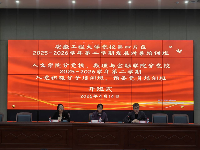 4月14日,安徽工程大学党校第四片区2025-2026学年第二学期发展对象培训班暨人文学院分党校、数理与金融学院分党校2025-2026学年第二学期入党积极分子培训班、预备党员培训班开班式在图书馆5楼会议室顺利举行。校党校督导许晓菁、人文学院党委书记刘一出席开班式,开班式由马克思主义学院党总支副书记裴利萍主持。人文学院、数理与金融学院、马克思主义学院组织员、培训班班主任及全体学员参加本次仪式。开班式前,校党委组织部副部长、党校督导朱文明到会指导。