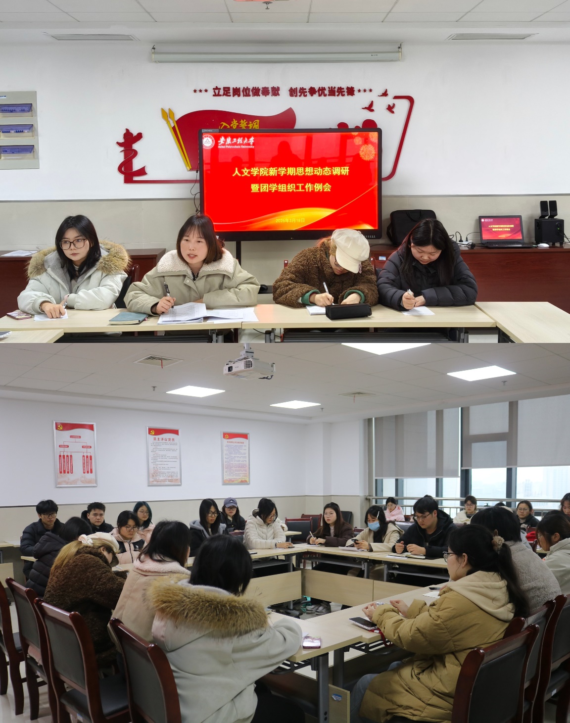 为全面把握新学期学生思想状况,科学谋划本学期团学工作,进一步统一思想、凝聚共识,推动学院团学工作高质量发展。3月18日,人文学院召开新学期思想动态调研暨团学组织工作例会,学院团委书记、各团学组织骨干成员参加会议。