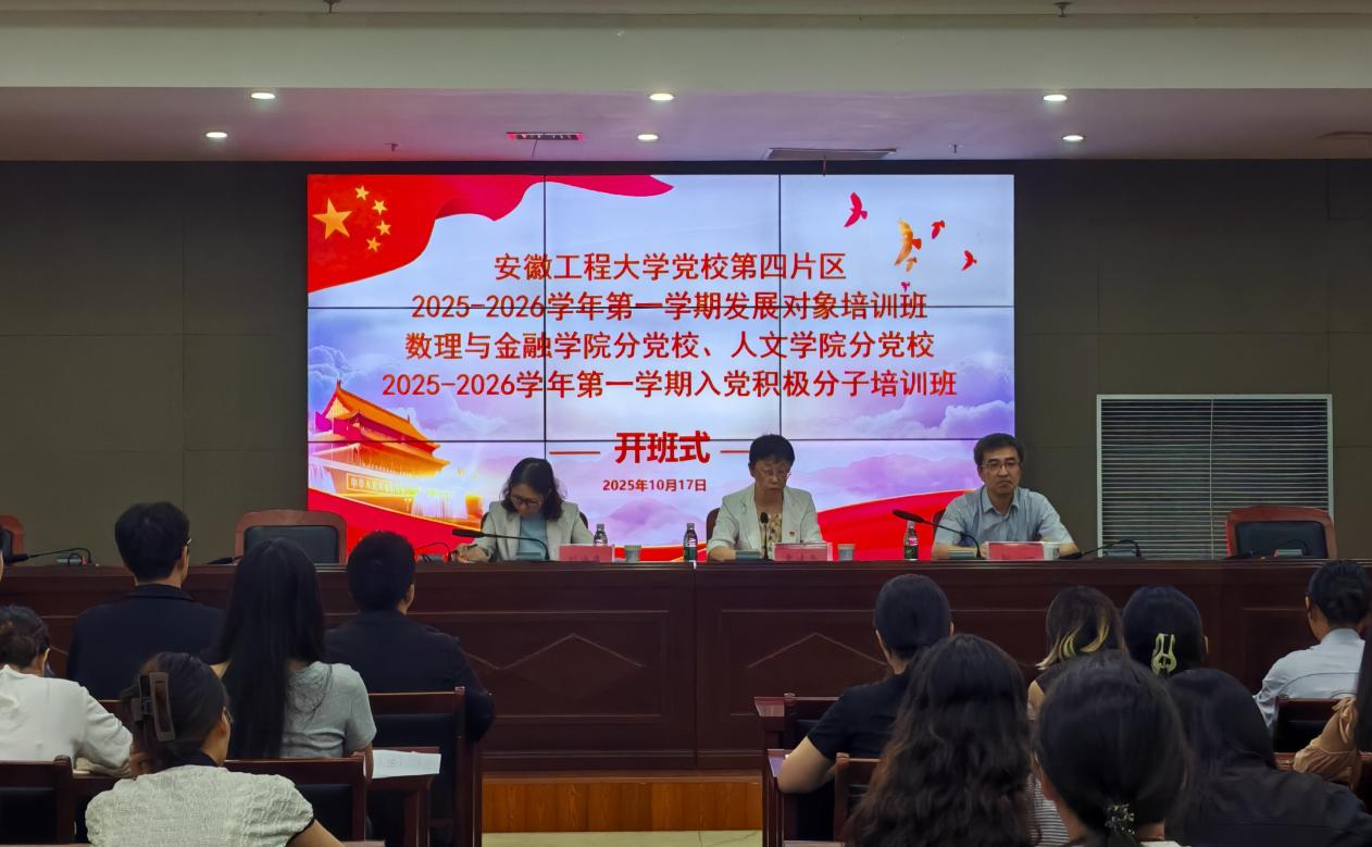 10月17日下午,安徽工程大学党校第四片区2025-2026学年第一学期发展对象培训班,数理与金融学院分党校、人文学院分党校2025-2026学年第一学期入党积极分子培训班开班式在学校图书馆202会议室举行。开班式由数理与金融学院党委书记彭海燕主持,校党委组织部正处级组织员章靖平,人文学院党委书记刘一,数理与金融学院、人文学院、马克思主义学院组织员,培训班班主任以及本期培训班的全体学员出席了开班式。