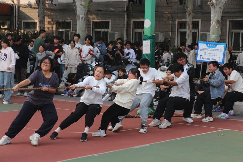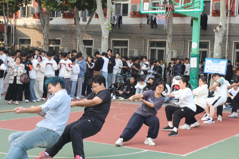 开赛前,各代表队围坐成圈,战术讨论声此起彼伏。从站位调整到发力节奏,从口号统一到心理调适,队员们通过反复推演将“个体力量”转化为“集体智慧”。“预备!”口令响起,参赛队员紧握绳索、身体后倾,眼神中透露出专注与决绝,现场氛围瞬间绷紧,仿佛连空气都凝结成一股无形的张力。“开始!”裁判一声令下,赛场瞬间沸腾,双方队员如蓄势待发的弓弦,将力量凝聚于手臂与腰背,传递到长绳上,绳索上的红色标记物在中线两侧激烈拉锯。场边拉拉队呐喊助威,“加油”声浪此起彼伏,与绳索的“吱呀”声交织成一首激昂的战歌。随着红色标记物缓缓越过终点线,胜负尘埃落定,胜利的欢呼与失落的叹息交织,无一不彰显着拼搏的荣光。