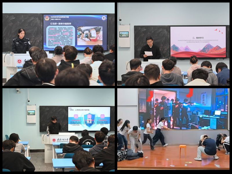 汤建文领学习近平总书记给天津大学师生的回信精神及关于打击治理电信网络诈骗犯罪工作的重要指示,强调青年学生需将个人成长与国家反诈战略相结合,树立“全民反诈”的责任意识。郭静微警官结合日常办案经验,以“刷单返利”“冒充客服”等校园高发骗局为切入点,通过还原作案流程、拆解诈骗话术,揭露“以小利诱骗”“制造恐慌”等核心套路,并传授“三不原则”等实用技巧。2025年暑期“三下乡”反诈实践团成员吴向阳分享了深入社区帮助居民识别“养老诈骗”“虚假投资”等陷阱,开展反诈宣传的经历。