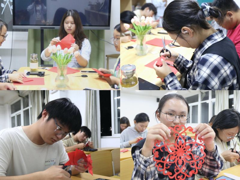 课堂上,许贵琦给大家讲解了剪纸这一民间艺术背后承载的历史故事与人们对美好生活的祈愿。同学们按照图例折叠纸张、描摹图案、剪起屑落,大家全神贯注,细心雕琢,一幅幅圆形团花陆续完成。大家热情高涨,相互指导折纸,不断尝试挑战复杂的图案,现场气氛热烈。