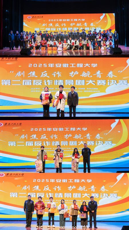 11月19日,学校第二届“剧焦反诈 护航青春”反诈情景剧大赛决赛在师生活动中心大礼堂成功举行。经过激烈角逐,《贵人》《爆裂无声》荣获一等奖,《皇帝,您醒醒啊!》等3个节目获二等奖,《九月围城》等5个节目获三等奖,另有23部作品获优秀奖。校党委常委、副校长张开炳,鸠江公安分局党委委员、副局长佘辉出席活动。市公安局刑侦支队电信网络犯罪侦查大队、城东新区派出所负责人,校党委宣传部、学工部、研工部、校团委、安全管理处和数理与金融学院负责人及各学院师生代表共1000余人观看了比赛。