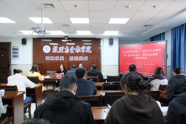 为深入学习宣传贯彻党的二十届四中全会精神,扎实推进全面从严治党,切实筑牢“十五五”时期风险防控屏障,11月26日下午,数理与金融学院举办“学习贯彻党的二十届四中全会精神暨‘强化规矩意识、规范招标采购’”专题纪法宣讲会。副校长周虹屏作专题宣讲,国资处主要负责人、学院全体教职工参加会议。会议由学院党委书记彭海燕主持。