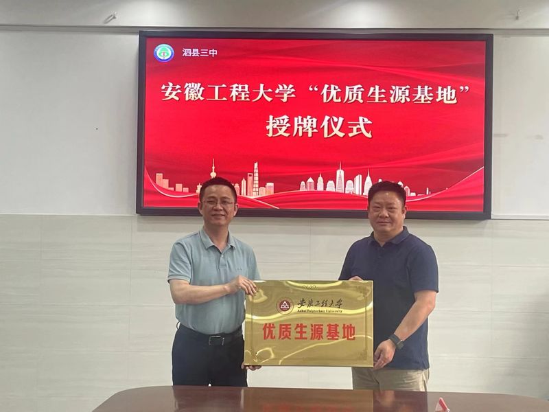 座谈之后,学院分别与宿州三中和泗县三中进行了安徽工程大学优质生源基地授牌仪式,葛飞对中学为安徽工程大学持续输送优质生源表示感谢。