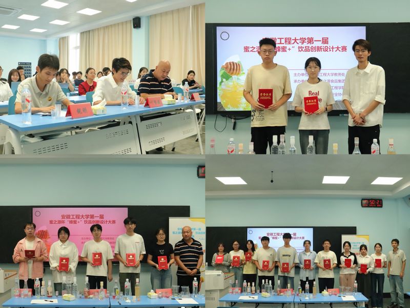 10月11日下午,由教务处主办,生物与食品工程学院、安徽蜜之源食品集团有限公司及食品营养与安全协会联合协办的安徽工程大学第一届蜜之源杯“蜂蜜+”饮品创新设计大赛在4教407举行。安徽蜜之源食品集团有限公司董事长叶繁盛、总经理倪刚,生物与食品工程学院食品科学与工程专业系部主任王顺民、专业教师朱秀灵、朱西平担任大赛评委。