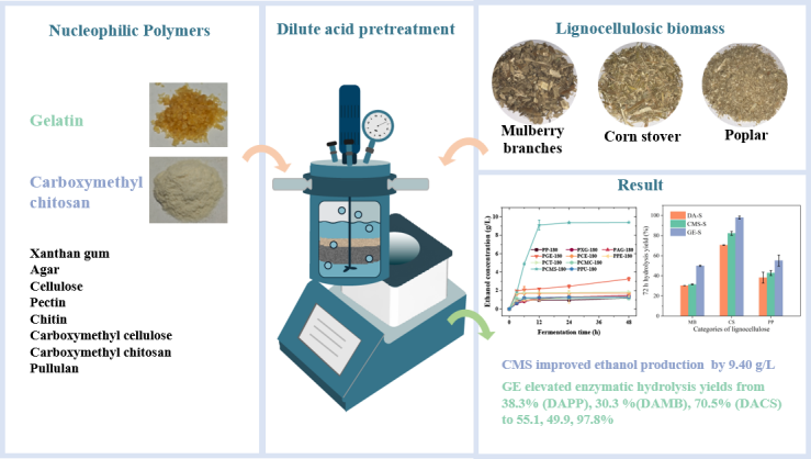 针对木质纤维原料稀酸预处理过程中产生大量发酵抑制物以及预处理物料酶水解效率受限的难题。本团队创新性地提出了“稀酸预处理过程中原位添加亲核聚合物”的策略,旨在通过原位添加的方式简单高效地提升木质纤维原料的生物转化效率。研究过程中,团队对九种亲核聚合物进行系统筛选与性能验证,筛选出羧甲基壳聚糖和明胶作为出色的双功能增强剂,可同步提升预处理液发酵性能和预处理物料酶水解效率。