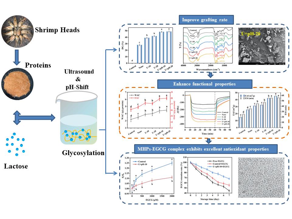 近日,我院王顺民教授研究团队在水产品副产物高值化利用领域取得重要突破。在食品领域著名期刊Food Chemistry: X(中科院1区Top影响因子8.2发表题为Effects of ultrasound combined with pH-shift assisted glycosylation modification on the structural and functional properties of by-product proteins extracted from shrimp heads”的最新研究成果。我校为第一署名单位,李玉锋博士为论文第一作者。