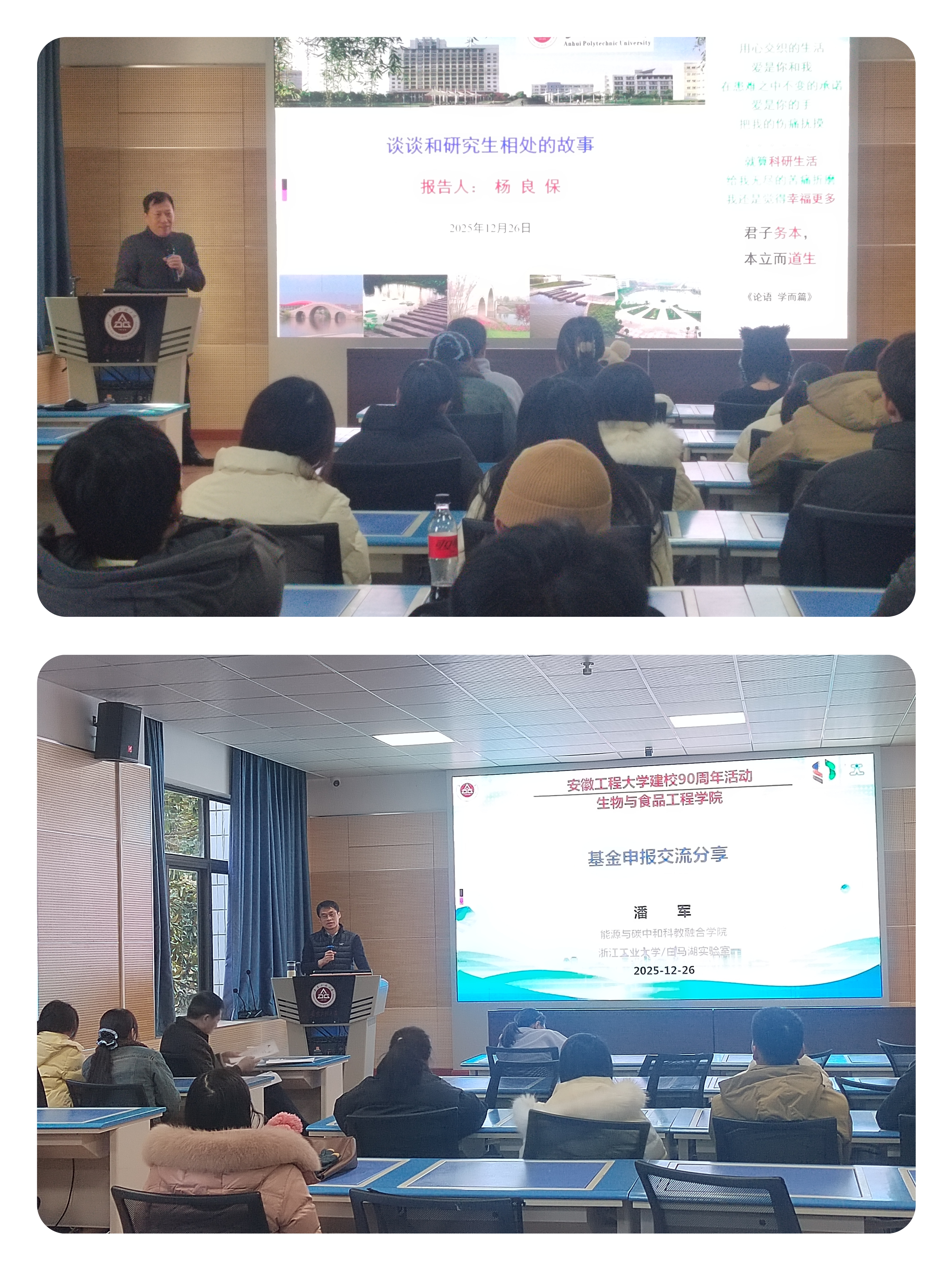 12月26日下午2:30,生物与食品工程学院学术交流报告会在虚拟仿真中心(老图书馆2 楼)成功举办。本次报告会特别邀请到中国科学院合肥物质科学研究院研究员杨良保、浙江工业大学教授潘军两位杰出校友返校,分别以 “谈谈和研究生相处的故事”“基金申报交流分享” 为主题,为学院师生带来了一场兼具深度与温度的学术盛宴。学院副院长刘艳主持报告会,部分教师及研究生代表到场聆听学习。