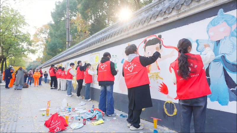 11月17日至21日,活动项目进入集中实施阶段。120余米的墙面前,团队成员们分组协作,有的负责勾线打底,有的负责上色填充,有的负责质量检查,形成了分工明确、衔接高效的工作流程。实施过程中,成员们不仅要克服天气变化、墙面不平整等技术难题,还要学会与市民沟通、协调现场秩序。这种在真实场景中解决问题的能力锻炼,正是劳动教育的价值所在。