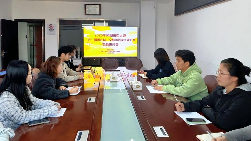 2025年10月,活动实施团队携手校团委发起“金色画卷”墙绘设计方案征集活动,打破以往由教师主导、学生执行的模式,让学生从项目源头就参与创意策划。征集活动共收到来自全校各学院340余份设计方案。活动实施团队与镜湖区环卫所先后召开三次线下专题研讨会,深入挖掘芜湖文化基因,共同打磨方案细节。最终,确立以 “杏福满江城,文脉承百家” 为核心主题,构思出以金色银杏叶为视觉纽带,串联十二生肖、哪吒、西游记、百家姓等传统文化元素,并融入方特、古城、造船厂等市民熟悉的地标景观,形成传统与现代交织、艺术与生活交融的墙绘创作方案。
