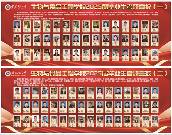 近三年,学院本科生在中国国际大学生创新大赛、“挑战杯”全国大学生课外学术科技作品竞赛、全国大学生生命科学竞赛、安徽省生物标本制作大赛、安徽省食品设计创新大赛等赛事中累计获得国家级奖项25项、省级奖项102项,发表学术论文10余篇,申请发明专利10余项。近年来毕业生去向落实率连续保持在95%以上,考研升学率稳定在35%以上,并于2022至2024年连续三年位列全校第一。毕业生就业高度集中于安徽及长三角地区,服务于伊利、溜溜梅、双汇、古井、迎驾等相关企业的总部与生产基地,所从事的行业精准聚焦于生物与食品等相关专业领域。