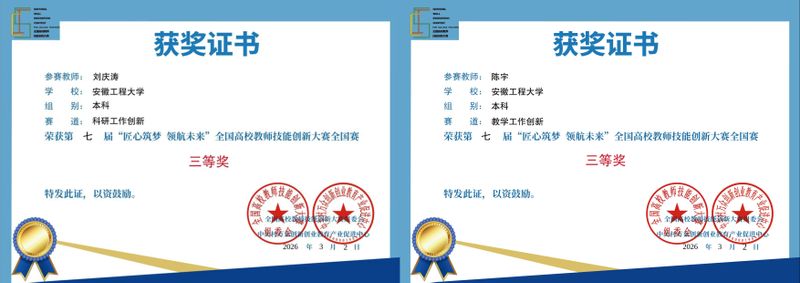近日,第七届“匠心筑梦与领航未来”全国高校教师技能创新大赛圆满落幕。我院教师凭借扎实的专业功底、创新的教学理念,在全国众多参赛选手中脱颖而出,荣获一等奖2名、二等奖3名、三等奖2名,获奖数量与质量再创佳绩,充分展现了学院教师队伍的过硬实力与良好风貌。