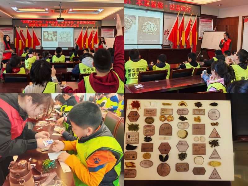 活动伊始,志愿者为孩子们讲解了30味中草药的性状与功效,引导大家通过看颜色、辨形状、闻气味、摸质地等方式认识药材特征,轻松掌握药材名称、入药部位及养生价值。互动环节中,孩子们踊跃分享学习心得,现场气氛热烈。在标本展示板制作环节,孩子们挑选心仪药材,在志愿者一对一协助下填写科普标签并规范粘贴,共同完成兼具科普性与观赏性的本草作品。