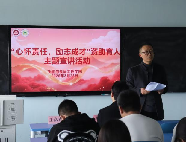 3月25日下午,生物与食品工程学院在6教303举办“心怀责任,励志成才”资助育人主题宣讲活动。学院党委副书记王彦青、资助工作联络员李良渊以及40余名学生代表参加活动。
