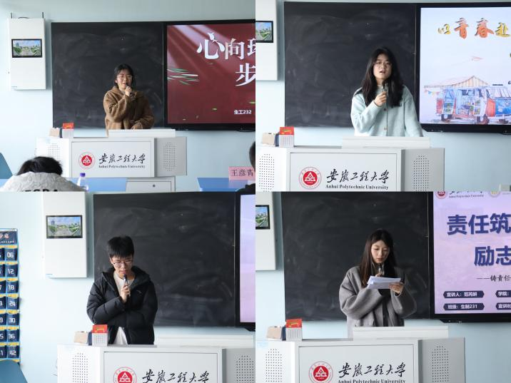 生工232班巫继宇以“心向璀璨,步履为证”为题,分享目标设定与时间管理的实践方法;生工242班周欣围绕“以青春赴使命,以实干筑成才”,讲述夯实学业、深耕科研的成长历程;生制243班谢晨志聚焦“责任、励志、方法、成才”,传授高效听课与知识体系构建的实用技巧;生制231班范芮妍以“责任筑梦,励志笃行”为题,系统讲解学科竞赛的全流程及宝贵经验。