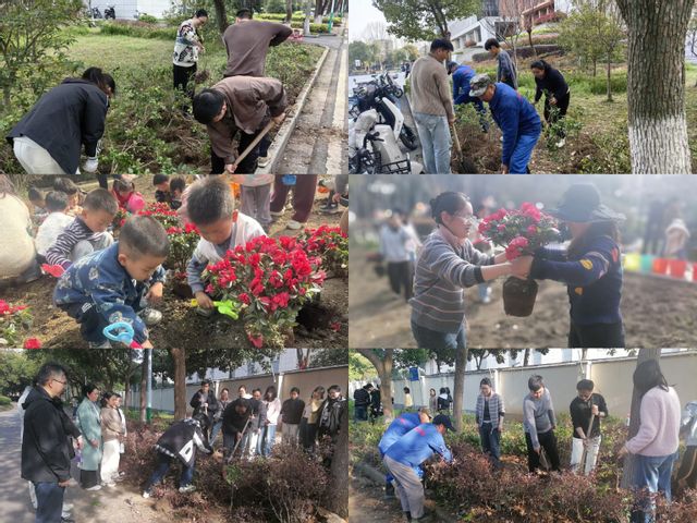 活动现场,党员志愿者们分工开展绿植移栽、杜鹃花种植,挥锹铲土、修根培土。企业员工协助搬运苗木、传授养护技巧。幼儿园小朋友化身“小小护绿员”,扶苗浇水、悬挂心愿卡。大家默契配合,经过近两小时劳作,为校园增添了片片新绿。