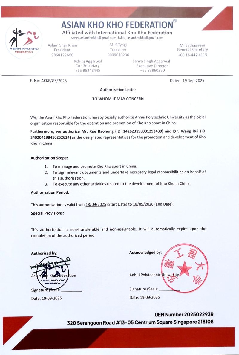10月28日,我校经过1年多的申请与资质审核,正式获亚洲Kho Kho联合会(ASIAN KHO KHO FEDERATION)(亚奥理事会的下一级组织)授予唯一中国全国性区域推广单位资质。同时,我校教师薛保红、我校校友王睿博士被联合会正式聘任为中国区域推广负责人,标志着我国 Kho Kho运动推广迈入专业化、体系化新阶段。
