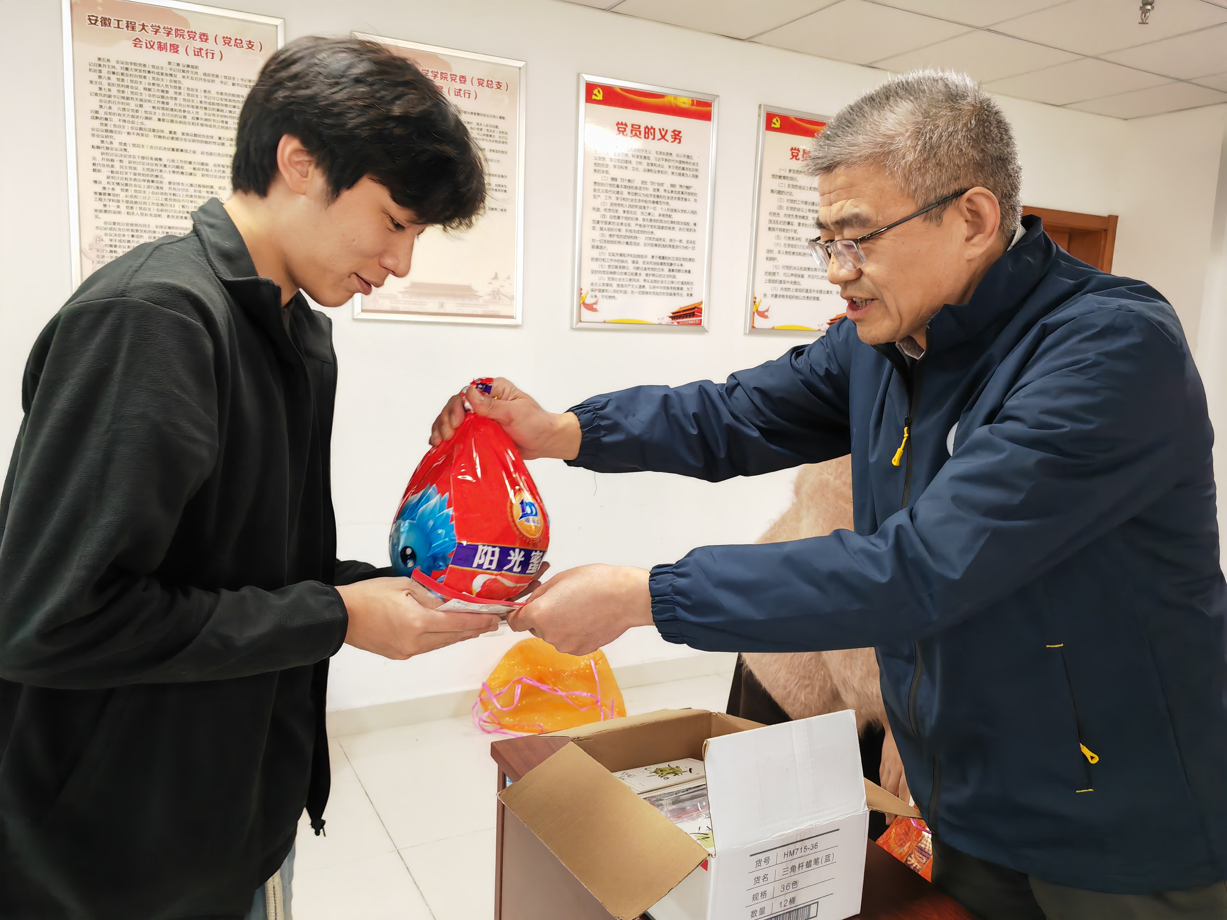 慰问活动的“暖心时刻”将现场气氛推向高潮。学院领导与老师们一同向考研学子发放了精心准备的 “决胜考研加油包” 。加油包内不仅有寓意“考研上岸”的柚子,还有实用文具等物资,更有一张张由学弟学妹手写的祝福卡片,字里行间充满了真诚的鼓励与美好的祝愿。一份份沉甸甸的礼物,承载着学院浓浓的关怀与期待。