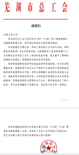 近日,市总工会向安徽工程大学表达了诚挚的感谢,感谢我校对市“工BA”比赛的大力支持。“工BA”比赛作为我市职工体育活动的重要组成部分,对于丰富职工的业余生活、增强职工的身体素质以及促进职工之间的交流与合作具有重要意义。我校作为城市建设合伙人,积极响应市总工会的号召,为比赛的顺利举办提供了全方位的支持。从场地的协调到后勤的保障,我校的配合让“工BA”比赛得以在良好的环境中进行,为参赛职工创造了优质的竞赛条件。