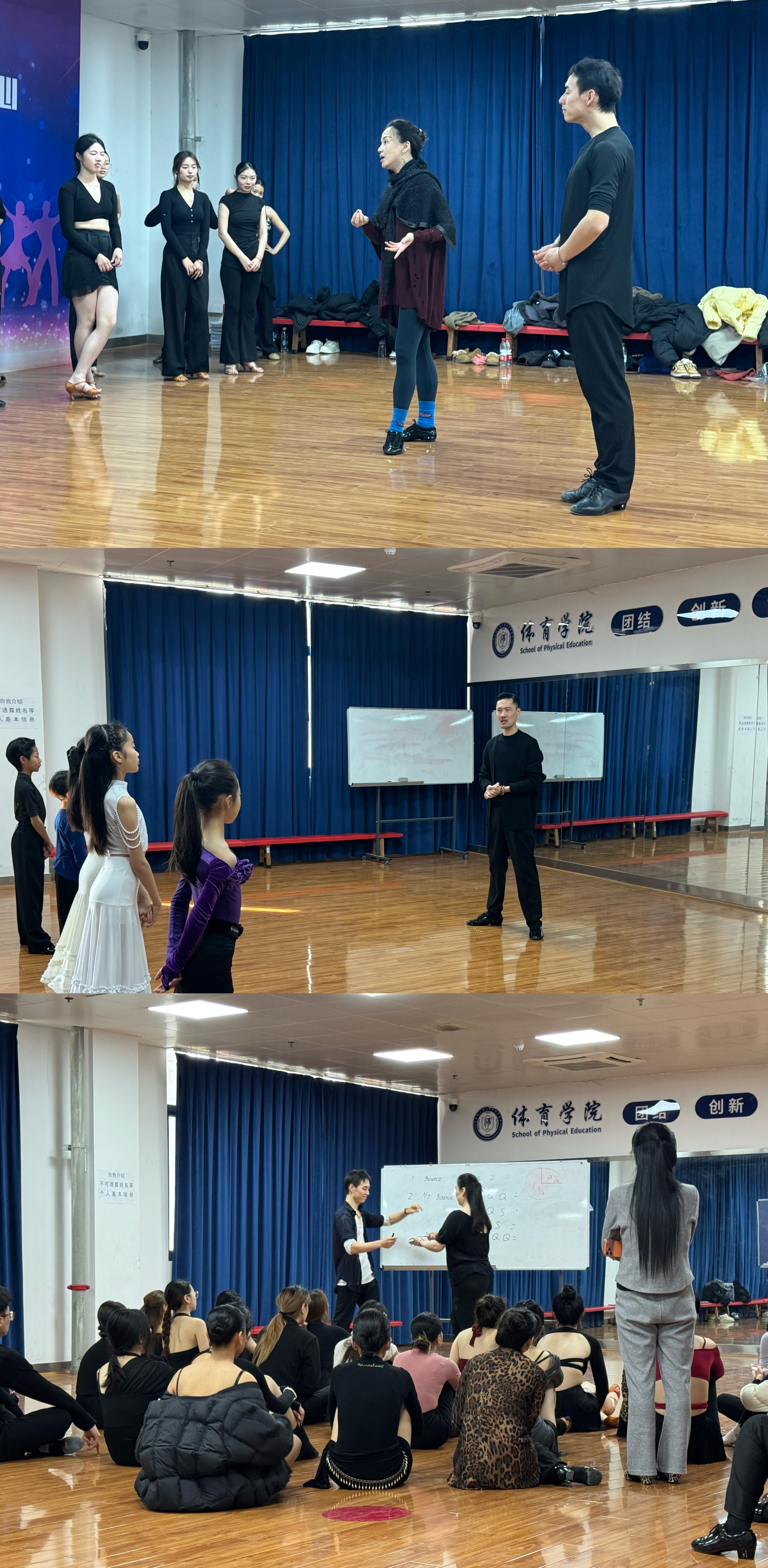 研习期间亮点纷呈:国家级裁判胡天仪以“裁判核心能力构建”作专题分享,结合执裁经验解析、规则解读、临场判断等核心要点,引发热烈互动;拉丁舞板块由国际级教师文亚莉主讲,青运会季军、全国冠军选手现场示范;标准舞板块邀连续七届全国职业组、A 组冠军赵鹏亲授,通过示范、指导、复盘进行深化交流。学院体育系教学骨干及体育舞蹈校队主力队员全程参与,积累教学改革实践素材。