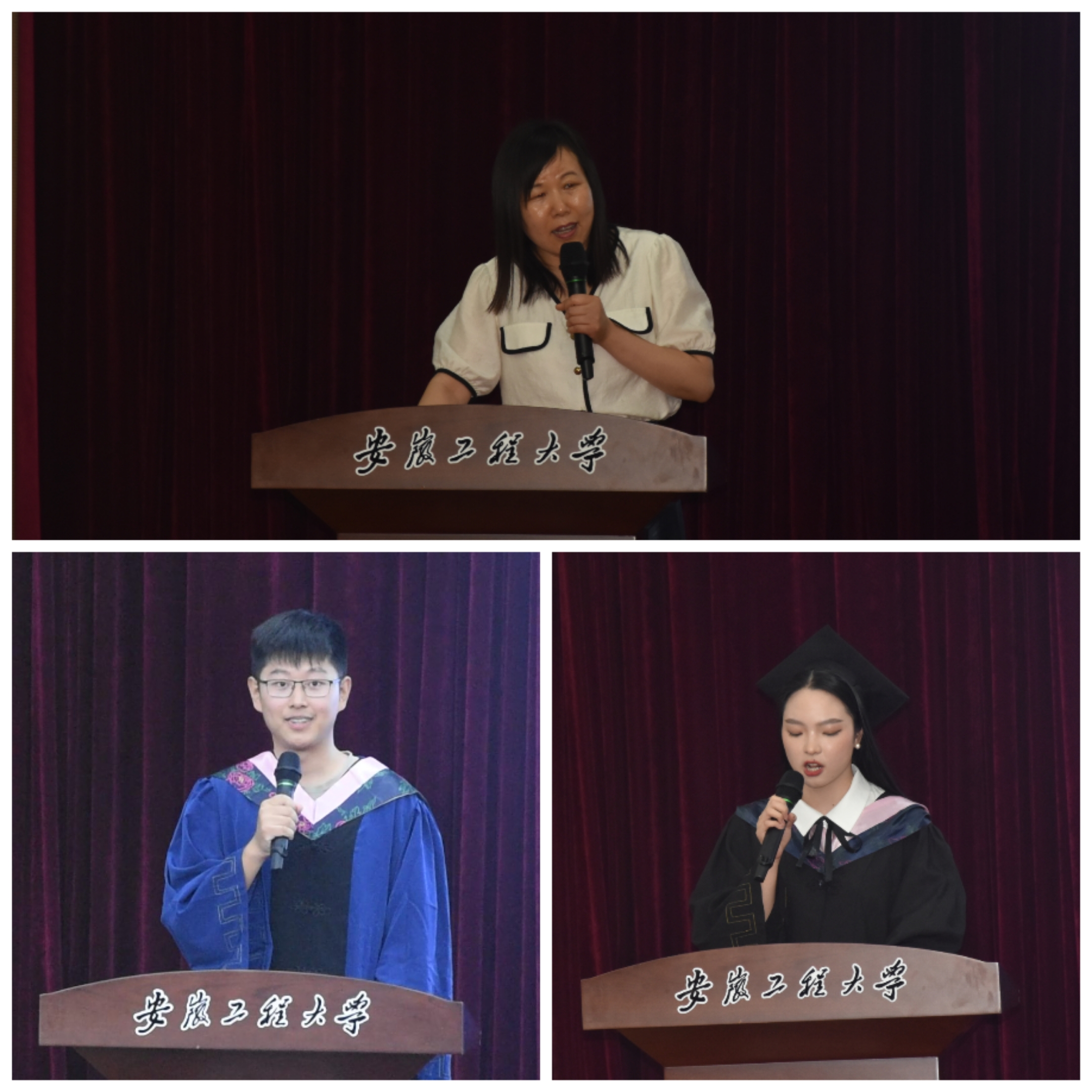 教师代表张凤梅老师结合自己的成长经历,向毕业生送去“六个敬畏”的叮嘱。硕士毕业生代表杨朋、本科生代表石文回顾求学期间在老师的谆谆教诲下不断成长的点点滴滴,用真挚的语言“老师,您辛苦了!”深情表达了对全体老师的尊敬和感激。