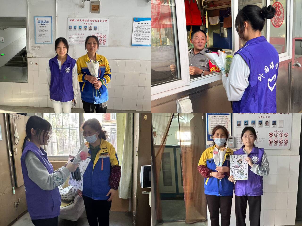 在五一国际劳动节来临之际,为弘扬劳动精神、致敬平凡坚守者,4月26日下午,外国语学院“紫阳花”志愿服务团队走进教工生活区,开展“致敬最美劳动者”特别行动,为十余名宿管员、门卫等基层工作者送上手绘画、鲜花与春日暖心礼包,用实际行动传递青年学子对劳动者的敬意。