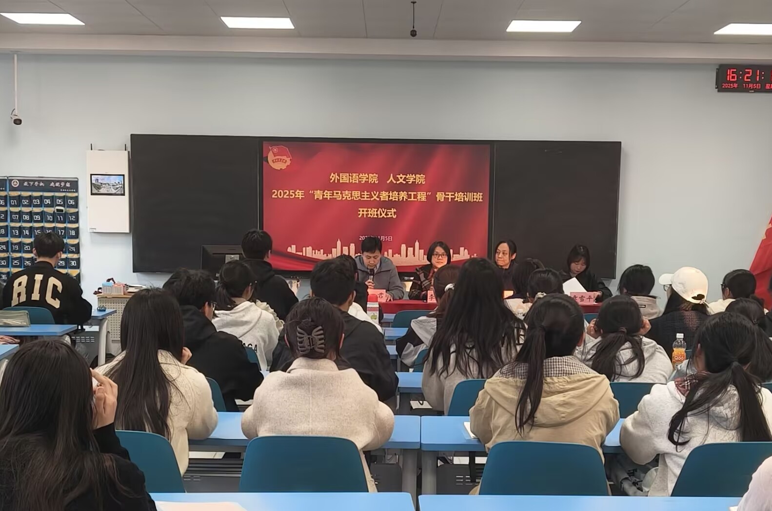 为深入学习贯彻习近平新时代中国特色社会主义思想,扎实推进青年马克思主义者培养工程,2025年11月5日下午,外国语学院与人文学院在6教301联合举行2025年“青年马克思主义者培养工程”骨干培训班开班仪式。外国语学院党委副书记李校林、人文学院党委副书记余本祺,培训班班主任张君、章雪平以及全体“青马班”学员近60人出席。