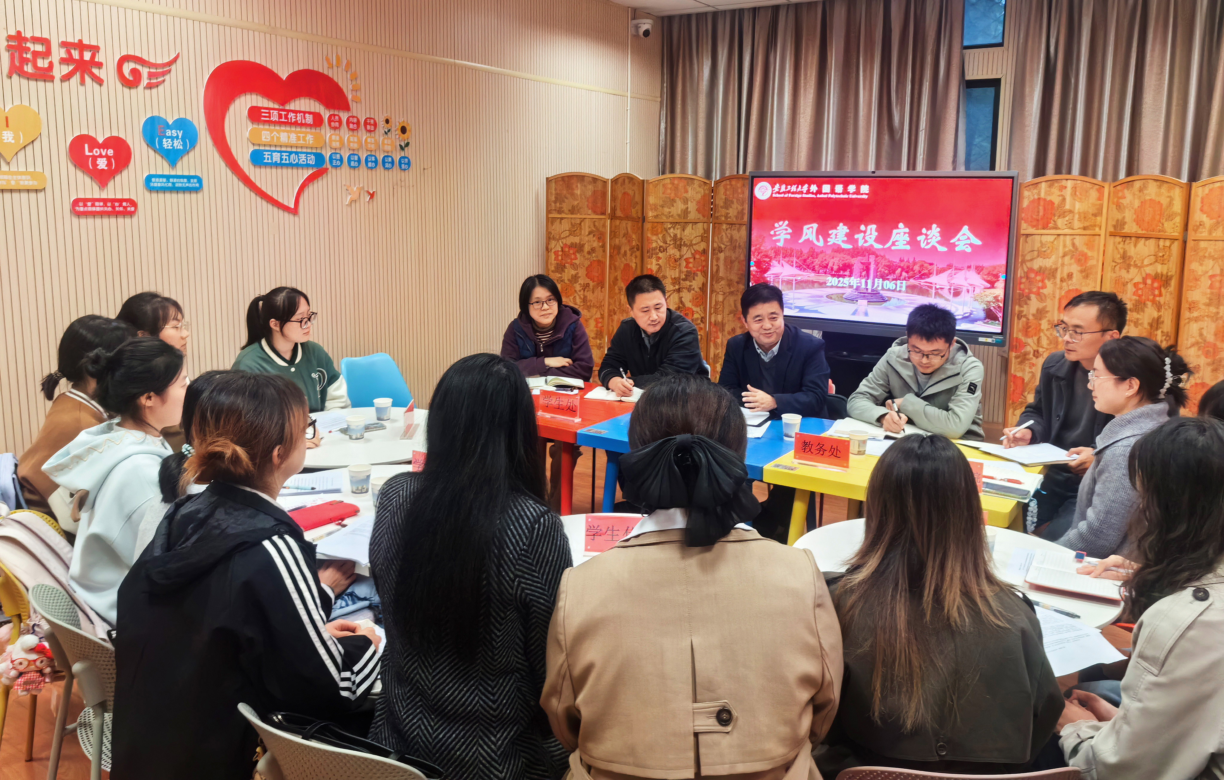 “图书馆的外文书籍可以更丰富些吗?”“考研党急需专业指导!”“宿舍楼道环境还能再升级一下不?”……11月6日下午,外国语学院学生社区“SMILE”阳光驿站里格外热闹,一场别开生面的学风建设座谈会正在这里火热进行中!