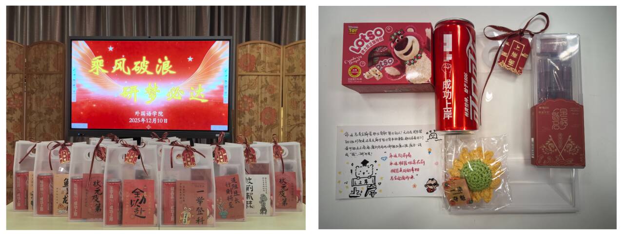 最令人动容的环节,莫过于暖心礼包的发放。老师亲手将满载关怀的礼包送到每一位学生代表手中,礼包里的每一件物品都暗藏巧思:实用的文具套装助力规范作答,印着定制姓名的可乐寓意“快乐冲刺”向日葵挂件承载着“一举夺魁”的美好期许,能量满满的牛轧糖为脑力消耗“充电续航”,而学弟学妹们亲笔书写的祝福卡片,更让这份关怀多了份青春同行的温度。“这份礼包太贴心了!不仅有实用的物资,更有满满的精神动力,我一定会把学院的关怀转化为冲刺的底气,全力以赴不负众望!”英语221班王宇鑫同学的发言道出了全体考研学子的心声。