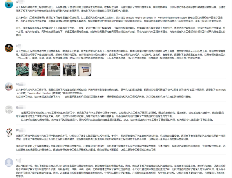 结合展板,肖平教授生动讲解了汽车的发展与车型演变历程,梳理了汽车工业从传统机械到智能出行的演进脉络,帮助大家建立起对汽车产业发展的整体认知。在智能汽车线控底盘系统安徽省重点实验室内,同学们观摩了先进的科研设备、创新产品原型及相关产学研合作项目,进一步深化了对汽车技术研究与产业实践结合的理解。同学们纷纷表示收获颇丰、受益匪浅,对《工程英语笔译》课堂上学习的汽车专业英语术语和相关英汉翻译材料内容有了直观具体的理解,这对精准把握术语内涵、理解文本内容逻辑关系、准确开展翻译工作起到了重要作用,对今后的专业学习和职业理解产生了积极影响。