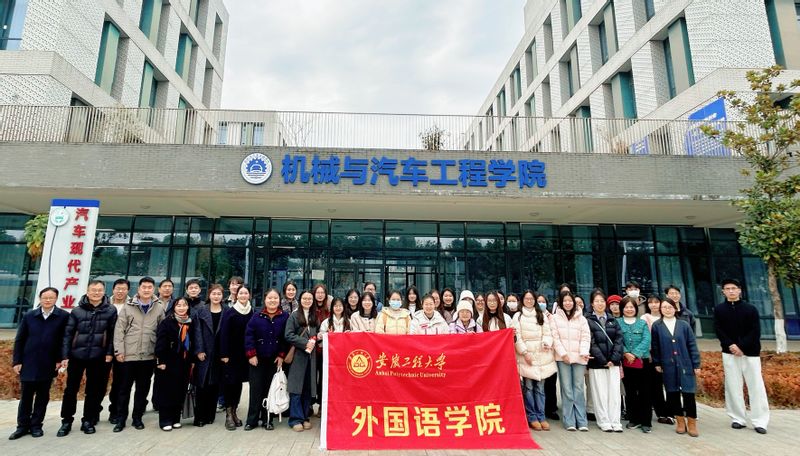 12月19日,外国语学院组织2024、2025级翻译硕士研究生前往机械与汽车工程学院,开展了一场以“工程翻译与科技认知”为主题的沉浸式研学活动。本次活动由学院副院长韩利敏积极对接和精心组织,学院副院长李新国、翻译硕士中心主任张凤梅带队,8位硕士生导师和翻译硕士研究生参加了本次活动。机械与汽车工程学院副院长张振、智能汽车线控底盘系统安徽省重点实验室主任肖平教授以及实验室相关负责人热情接待了外国语学院师生一行。活动聚焦工程科技翻译中的真实语境与专业认知需求,通过实地探访高端实验室、对话前沿技术,着力提升学生在机械与汽车领域的专业素养与翻译转换能力。